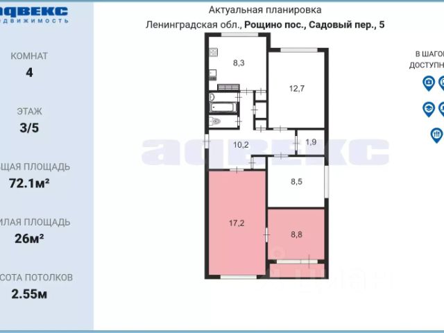 В поселке с развитой инфраструктурой и отличным транспортным сообщением в 3-х комнатной квартире комната 17.3 кв.м., на 2-ом этаже 5-ти этажного панельного многоквартирного дома.