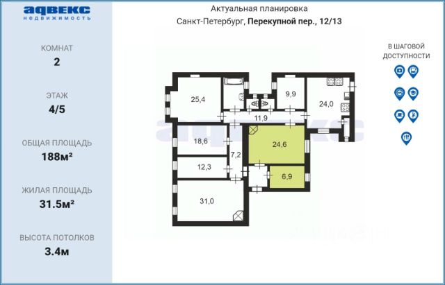 - 20-25 минут пешком, 7 минут на автомобиле до станции метро Площадь Александра Невского, Елизаровская. В шаговой доступности Невский проспект. В собственности более 3-х лет, два собственника.