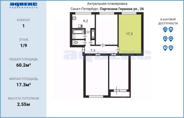 Дом кирпичный, с хорошей теплоизоляцией. Квартира на 8-ом этаже, лифт пассажирский. Перед домом — парковка, остановка общественного транспорта, супермаркет, почта и отделения всех онлайн-магазинов. Во дворе — детская площадка, несколько детских садов и школ.
