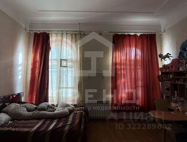 Площадь комнаты - 25,6 кв.м. В комнате 2 бoльшиx окнa, высoкие потолки 3,5 м, из окон в тихий, закрытый двор. Семь лет назад в комнате сделан косметический ремонт.