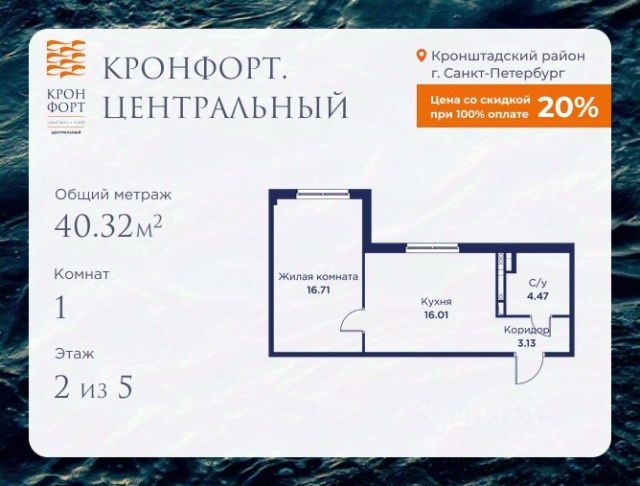 Стоимость квартиры указана со скидкой 20%. Скидка предоставляется при 100% оплате или несубсидированной ипотеке. Предлагается квартира площадью 52.3 кв.м в жилом комплексе "Кронфорт. Центральный" в Санкт-Петербурге (Кронштадт). Возможна покупка с использованием льготных и специальных ипотечных программ с государственной поддержкой. Высота потолков в квартирах — от 3 до 3,4 метров, окна увеличенного размера, есть варианты с эркерами, французскими балконами, лоджиями и террасами. Жилой квартал состоит из пяти четырехэтажных корпусов с закрытыми охраняемыми дворами, свободными от машин. Первые этажи формируют торговые променады в стиле пешеходных улиц исторической части Петербурга и Кронштадта. Внутренние пространства между корпусами — пешеходные зоны с уютными площадями. Архитектурный облик квартала разработан бюро "Проектная культура" и международной компанией Chapman Taylor. Инфраструктура комплекса включает: - Лицей с двумя бассейнами - Детский сад на 150 мест с бассейном и закрытой территорией - Веревочный парк - Игровые площадки для активного отдыха; - Кабинет врача общей практики. - Подземные паркинги с лифтами. - Мусоросборные камеры, индивидуальные кладовые. - Закрытые дворы с контролем доступа и видеонаблюдением. - Мультформатный стрит-ретейл с кафе и ресторанами. - Триатлон-центр и беговые/велодорожки. - Учебно-тренировочный комплекс для детей "Лагерь настоящих героев". Транспортная доступность обеспечивает удобный выезд на КАД (около 1-3 км), 2 минуты пешком до автобусной остановки "Лицей", 25 минут до Сестрорецка, 30 минут до "Лахта-центра", 50 минут до аэропорта "Пулково" и 60 минут до Московского вокзала. Для любителей моря доступен маршрут на "Метеоре" до центра Санкт-Петербурга. Отделка квартир предлагается как с готовой чистовой отделкой, так и со свободной планировкой без отделки для реализации индивидуальных дизайнерских решений. В третьем корпусе, продажи которого стартовали в марте 2025 года, доступны квартиры с просторными террасами, тремя балконами, кухнями-гостиными до 38 кв.м с окнами на две стороны, обеспечивающими панорамное освещение и виды. Если вам нужна помощь с оформлением ипотеки или дополнительная информация по комплексу и условиям покупки, обращайтесь в отдел продаж за консультацией. Продаю квартиру евродвушку в Кронштадте.