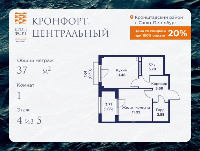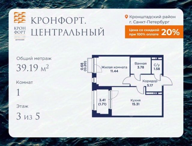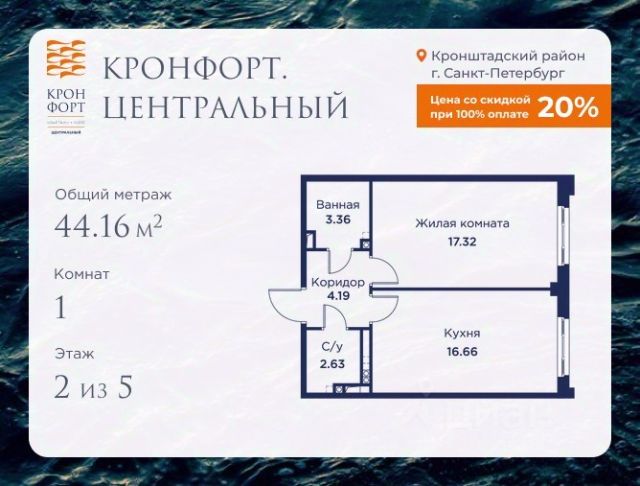 Стоимость квартиры указана со скидкой 20%. Скидка предоставляется при 100% оплате или несубсидированной ипотеке. Предлагается квартира площадью 52.3 кв.м в жилом комплексе "Кронфорт. Центральный" в Санкт-Петербурге (Кронштадт). Возможна покупка с использованием льготных и специальных ипотечных программ с государственной поддержкой. Высота потолков в квартирах — от 3 до 3,4 метров, окна увеличенного размера, есть варианты с эркерами, французскими балконами, лоджиями и террасами. Жилой квартал состоит из пяти четырехэтажных корпусов с закрытыми охраняемыми дворами, свободными от машин. Первые этажи формируют торговые променады в стиле пешеходных улиц исторической части Петербурга и Кронштадта. Внутренние пространства между корпусами — пешеходные зоны с уютными площадями. Архитектурный облик квартала разработан бюро "Проектная культура" и международной компанией Chapman Taylor. Инфраструктура комплекса включает: - Лицей с двумя бассейнами - Детский сад на 150 мест с бассейном и закрытой территорией - Веревочный парк - Игровые площадки для активного отдыха; - Кабинет врача общей практики. - Подземные паркинги с лифтами. - Мусоросборные камеры, индивидуальные кладовые. - Закрытые дворы с контролем доступа и видеонаблюдением. - Мультформатный стрит-ретейл с кафе и ресторанами. - Триатлон-центр и беговые/велодорожки. - Учебно-тренировочный комплекс для детей "Лагерь настоящих героев". Транспортная доступность обеспечивает удобный выезд на КАД (около 1-3 км), 2 минуты пешком до автобусной остановки "Лицей", 25 минут до Сестрорецка, 30 минут до "Лахта-центра", 50 минут до аэропорта "Пулково" и 60 минут до Московского вокзала. Для любителей моря доступен маршрут на "Метеоре" до центра Санкт-Петербурга. Отделка квартир предлагается как с готовой чистовой отделкой, так и со свободной планировкой без отделки для реализации индивидуальных дизайнерских решений. В третьем корпусе, продажи которого стартовали в марте 2025 года, доступны квартиры с просторными террасами, тремя балконами, кухнями-гостиными до 38 кв.м с окнами на две стороны, обеспечивающими панорамное освещение и виды. Если вам нужна помощь с оформлением ипотеки или дополнительная информация по комплексу и условиям покупки, обращайтесь в отдел продаж за консультацией. Квартира в доме не старше 15 лет в Кронштадте.