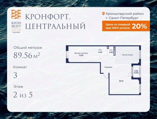 Стоимость квартиры указана со скидкой 20%. Скидка предоставляется при 100% оплате или несубсидированной ипотеке. Предлагается квартира площадью 79.41 кв.м в жилом комплексе "Кронфорт. Центральный" в Санкт-Петербурге (Кронштадт). Возможна покупка с использованием льготных и специальных ипотечных программ с государственной поддержкой. Высота потолков в квартирах — от 3 до 3,4 метров, окна увеличенного размера, есть варианты с эркерами, французскими балконами, лоджиями и террасами. Жилой квартал состоит из пяти четырехэтажных корпусов с закрытыми охраняемыми дворами, свободными от машин. Первые этажи формируют торговые променады в стиле пешеходных улиц исторической части Петербурга и Кронштадта. Внутренние пространства между корпусами — пешеходные зоны с уютными площадями. Архитектурный облик квартала разработан бюро "Проектная культура" и международной компанией Chapman Taylor. Инфраструктура комплекса включает: - Лицей с двумя бассейнами - Детский сад на 150 мест с бассейном и закрытой территорией - Веревочный парк - Игровые площадки для активного отдыха; - Кабинет врача общей практики. - Подземные паркинги с лифтами. - Мусоросборные камеры, индивидуальные кладовые. - Закрытые дворы с контролем доступа и видеонаблюдением. - Мультформатный стрит-ретейл с кафе и ресторанами. - Триатлон-центр и беговые/велодорожки. - Учебно-тренировочный комплекс для детей "Лагерь настоящих героев". Транспортная доступность обеспечивает удобный выезд на КАД (около 1-3 км), 2 минуты пешком до автобусной остановки "Лицей", 25 минут до Сестрорецка, 30 минут до "Лахта-центра", 50 минут до аэропорта "Пулково" и 60 минут до Московского вокзала. Для любителей моря доступен маршрут на "Метеоре" до центра Санкт-Петербурга. Отделка квартир предлагается как с готовой чистовой отделкой, так и со свободной планировкой без отделки для реализации индивидуальных дизайнерских решений. В третьем корпусе, продажи которого стартовали в марте 2025 года, доступны квартиры с просторными террасами, тремя балконами, кухнями-гостиными до 38 кв.м с окнами на две стороны, обеспечивающими панорамное освещение и виды. Если вам нужна помощь с оформлением ипотеки или дополнительная информация по комплексу и условиям покупки, обращайтесь в отдел продаж за консультацией.