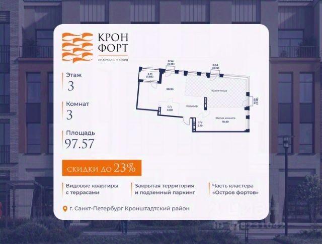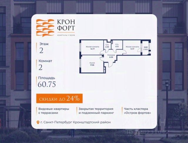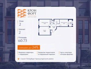 Повышение цен с 10.04! Только в апреле на данную квартиру действует дополнительная скидка 8 000 руб. с кв.м. Стоимость квартиры в объявлении указана со скидкой 21%. Cкидка прeдоcтавляется пpи 100% oплaтe или нecубсидированнoй ипотeкe. Возможно повышение скидки до 24%. Подробности уточняйте в отделе продаж. Предлaгaeтся квартира плoщaдью 60.75 кв.м в жилом кoмплексе "Kронфoрт. Центpальный" в Санкт-Петeрбурге (Кронштадт). Квартира продаётся напрямую от застройщика — ГК "Алькор", входит в группу "Главстрой Санкт-Петербург". Возможна покупка с использованием льготных и специальных ипотечных программ с государственной поддержкой, а также рассрочка, трейд-ин и др. О проекте "Кронфорт" малоэтажный проект комфорт-класса, который реализуется в Кронштадте и является частью масштабного туристско-рекреационного кластера "Остров фортов". Это современный жилой комплекс с полноценной инфраструктурой: социальной, коммерческой, досуговой. Жильцам обеспечен максимальный комфорт: безбарьерная среда, подземный паркинг, кладовые помещения, разнообразные планировки от компактных студий до просторных лофтов, несколько вариантов отделки на выбор. Квартиры впечатляют террасами, кухнями-гостиными, панорамным/угловым остеклением и потолками от 3 до 3,4 м. Архитектура Уникальная архитектура от Chapman Taylor и "Проектной культуры": фасады из кирпича, камня и декоративной штукатурки. Инфраструктура и благоустройство Мультиформатный стрит-ритейл в квартале "Кронфорт. Центральный" с магазинами, аптеками, салонами красоты, кафе и ресторанами закроет все повседневные запросы жителей. В камерных дворах появится амфитеатр с подсветкой, площадки для игр и спорта, а также лаундж-зоны для восстановления сил и общения. Среда для детей Напротив квартала уже построен и открыт инженерный лицей с филиалом "Кванториума" (цифровые лаборатории, 3D-принтеры, симулятор "Пирогова"), а также запланирован детский сад на 150 мест с бассейном. Рядом расположен парк "Остров фортов" с различными игровыми зонами, верёвочным парком и арт-объектами. Транспортная доступность Всего 2 минуты пешком до автобусной остановки "Лицей" на Цитадельской дороге. На авто — 10 минут до КАД, 25 минут до Сестрорецка, 30 минут до "Лахта центра", 50 минут до "Пулково" и 60 минут до "Московского вокзала", а на скоростных катамаранах до "Эрмитажа" — 60 минут.