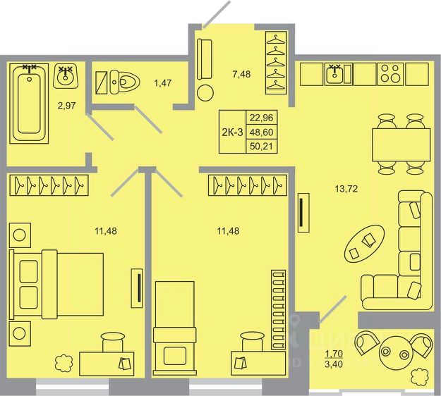 • 59 кв. м уюта и порядка: две просторные комнаты (по 13,4 кв. м) для родителей и ребёнка или кабинета, и большая кухня-гостиная (10,5 кв. м) — сердце вашего дома для приятных семейных вечеров.
