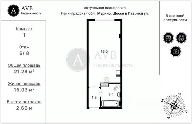 Продаётся 1-комнатная квартира в сданном доме (Шоссе в Лаврики, 78к3 (Корпус 10)), срок сдачи: III-кв. 2023, общей площадью 28.6 кв.м., на 6 этаже. Расположение, транспортная доступность В состав жилого квартала со сказочным названием "Тридевяткино царство" входят 11 кирпично-монолитных домов эконом-класса высотой от 9 до 18 этажей, а также сопутствующая инфраструктура. До Санкт-Петербурга от "Тридевяткина царства" 18 километров, до КАД - 3 километра; до единственной в Ленинградской области станции метро "Девяткино" 2 километра. Рядом с метро "Девяткино" находится одноимённая железнодорожная станция, от которой на проходящих скоростных электропоездах можно за двадцать минут доехать до Финляндского вокзала Санкт-Петербурга. В посёлке Мурино в районе метро и железнодорожной станции "Девяткино" расположен междугородный Северный автовокзал, от которого отправляются рейсовые автобусы в разные районы Ленинградской области, в другие города и в Белоруссию. Инфраструктура Внутренняя инфраструктура "Тридевяткина царства" представлена детским садом и школой, которые располагаются на его территории, а также разнообразными магазинами, кафе и предприятиями услуг, размещенными на первых этажах зданий. В посёлке Мурино и в располагающейся по соседству деревне Новое Девяткино расположено: несколько детских садов (в том числе частный детский сад), школа, супермаркеты, универсам "Полушка", кафе, несколько продуктовых и хозяйственных магазинов, отделения банков, спортивный клуб. Рядом находятся горнолыжные центры - "Охта-парк" и "Северный склон". Экологическая обстановка в районе оценивается как благоприятная. Промышленных предприятий и крупных транспортных магистралей поблизости нет. Рядом находятся Охтинская долина, лесопарковые зоны, поля и озёра, протекает река Охта. Надёжность застройщика Строительством жилого комплекса "Тридевяткино царство" занималась группа компаний "Унисто Петросталь", в состав которой входит более десяти предприятий, осуществляющих полный цикл работ по возведению жилых, коммерческих и промышленных объектов. Холдинг имеет большую историю, начавшуюся ещё в 1966 году с треста "Ташкентстрой". Основное направление деятельности ГК "Унисто Петросталь" - строительство кварталов и микрорайонов из многоэтажных и малоэтажных домов в Ленинградской области, а также возведение коммерческой и промышленной недвижимости в Санкт-Петербурге. В портфолио ГК "Унисто Петросталь" жилые комплексы: "Аннинский парк", "Багатель", "Чудеса света", "Новое Девяткино". Также компания построила бизнес-центр "Охта-Хаус", несколько складских комплексов, магазинов и другую коммерческую и промышленную недвижимость в Санкт-Петербурге и Ленинградской области. Архитектура В жилом комплексе "Тридевяткино царство" представлены квартиры с количеством комнат от одной до четырёх (а также квартиры-студии) площадью от 24 кв. метров до 111 кв. метров. Потолки в помещениях имеют высоту 275 см. Все квартиры предлагаются к продаже с полноценной финишной отделкой - со всеми коммуника