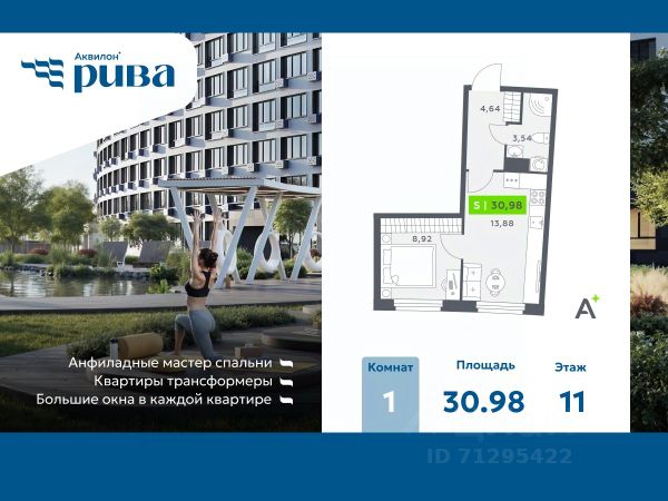 ЖК "Аквилон РИВА" - жилой комплекс комфорт класса у метро Девяткино от Группы Аквилон В самом сердце двора раскинулся собственный водоём — не просто украшение, а часть вашей повседневной жизни. Летом — это благоустроенная набережная для прогулок, отдыха в тени деревьев и тихих вечеров у воды. А зимой водоём превращается в залитый каток — место, где звучит смех, скользят коньки и рождаются семейные традиции. Здесь каждое время года раскрывает свой характер. Зона уединения: Места для занятия йогой и медитаций Мульти скворечники Качели с подсветкой для уютных бесед Высокие скамейки на набережной для отдыха и чтения на свежем воздухе Активная зона: Развивающие детские площадки для разных возрастов Спортивные площадки с зоной Ворк-аут, Столы для настольного тенниса Площадка для пляжного волейбола Преимущества Увеличенные окна с заполнением аргоном Корзины под кондиционеры Сити-боксы вместо балконов Безбарьерная среда Бесшумные скоростные лифты Контроль доступа на территорию и видеонаблюдение Отделка квартир Чистовая отделка в трех цветовых решениях: Sand, Terra и Graphite Дозаказ для любой квартиры Стандарты Группы Аквилон для вашей комфортной жизни Thermo-S экономия на коммунальных платежах за счет дополнительно утепленных стен, кровли и цоколя. Энергоэффективные окна с селективным покрытием и аргоновым заполнением Soundstop - дополнительная шумоизоляция внутренних перегородок и межэтажных перекрытий, шумозащитные окна, малошумные лифты Light-in - в квартирах устанавливаются широкоформатные окна, увеличены на 30%. Высота подоконников на уровне 60 см от пола. Vent-in - в каждой комнате есть клапаны индивидуальной вентиляции, которые обеспечивают приток свежего воздуха с улицы. inHOME умный дом в каждой квартире Интеллектуальная цифровая система, которая позволит дистанционно решать бытовые вопросы, управлять квартирой и экономить на оплате коммунальных услуг. В состав inHOME входят: IP-домофон, Face key, "умные" счетчики, датчики протечки, дистанционное отключение розеток, и т.д. Паркинг Отдельно стоящий 3-х уровневый паркинг Электрозарядки на территории ЖК Локация м. Девяткино 5 минут Центр города - 20 минут КАД 5 минут #ZMuMaE Купить квартиру площадью примерно 30 м2 (кв.м.) в Мурино.