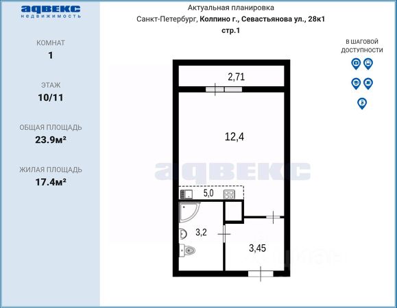 Строим кварталы для жизни с заботой о будущем. Предлагается студия комфорт-класса площадью 21,83 кв.м в корпусе 33 на 5-м этаже, в жилом комплексе "Новое Колпино". В варианте с предчистовой отделкой мы развели коммуникации по помещениям, выровняли и зашпаклевали стены, подготовили пол к чистовому покрытию. Ваша будущая квартира готова к финишному ремонту. Осталось выбрать, какие оттенки будут в вашем интерьере и воплотить дизайнерские идеи. Приобрести квартиру возможно по специальным акциям от застройщика, с текущими условиями акций можно ознакомиться в блоке "Акций". Цена динамическая и может отличаться, уточняйте актуальность у застройщика. Квартал "Новое Колпино" — современный квартал в тихом и зеленом районе Санкт-Петербурга. Здесь можно подолгу любоваться пышными кронами деревьев, подставляя лицо теплым лучам солнца. А еще в любой момент можно сесть в машину и уже через час оказаться в сердце Северной столицы. Будет легко планировать поездки: до центра Петербурга, или площади Восстания, — 25 минут на поезде. С территории квартала удобно выезжать на крупные магистрали: путь до Южного шоссе займет 15 минут на авто, а до Петрозаводского шоссе — всего 6 минут. В 20 минутах на авто находится метро "Рыбацкое", а в 7 минутах — ж/д станция Колпино. Проводите выходные на природе в Колпинском парке, который находится недалеко от квартала, на берегу реки Ижоры. Летом здесь можно вместе с детьми веселиться на аттракционах, кататься на лодке, играть в бадминтон или волейбол. А еще можно захватить орехов и покормить белок. Всего 7 минут на авто или автобусе — и вы в центре города Колпино. Взрослых впечатлит русская архитектура старинных церквей, а детям понравится забавный памятник героям мультфильма "Трое из Простоквашино". В "Новом Колпино" будут работать 4 детских сада, 3 из них уже готовы встречать малышей. Ребята постарше могут ходить на занятия в школу с собственным бассейном, в проекте уже работает новая современная школа с бассейном Корпуса высотой 11 этажей с французскими и панорамными балконами отделаны штукатуркой и облицовочным кирпичом. Вдохновение для палитры нам подарили оттенки рассветного неба: терракотовый, персиковый, песочный. Во дворе найдется интересное занятие для всех жителей квартала. Взрослые смогут устраивать тренировки на свежем воздухе в спортивных зонах, дети будут целый день веселиться на игровых площадках. А еще мы позаботились о вашей безопасности и закрыли дворы от машин. Возвращайтесь домой с чемоданом из путешествия или коляской из парка. На пути в подъезд вы не встретите ступенек. Оставить транспорт можно будет в специальном помещении на первом этаже. По желанию вы сможете получить ключи от квартиры с готовой отделкой. Мы положим ламинат, поклеим обои, установим мебель и сантехнику. Доступен вариант с готовой кухней — бежевые тона отделки станут фоном для интерьера мечты. Чтобы сразу отпраздновать новоселье, закажите у нас декор и мебельные сеты. А если хочется воплотить собственные идеи в интерье Квартира до 5 млн рублей в Колпино.