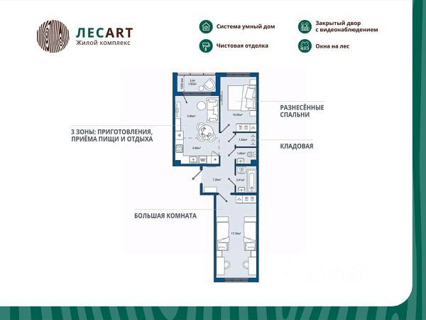 Просторная кухня-гостиная 20,2 кв.м., с четким зонированием пространства, позволит встречать гостей и проводить семейные вечера. Правильной формы комнаты 14,8+10,2 кв.м. - это отличный вариант для большой семьи или сдачи в аренду.