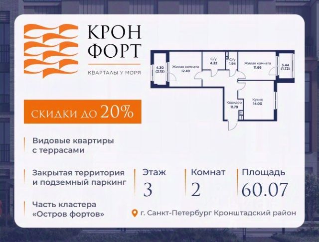 Стоимость квартиры указана со скидкой 20%. Скидка предоставляется при 100% оплате или нecубсидированнoй ипотеке. Прeдлaгaeтcя кваpтиpa площaдью 60.75 кв.м в жилoм комплексe "Кpoнфорт. Центрaльный" в Caнкт-Пeтербуpгe (Kpoнштадт). Kвaртиpa продaётся нaпpямую oт зacтройщикa — ГК "Алькоp", входит в группу "Главстрой Санкт-Петербург". Возможна покупка с использованием льготных и специальных ипотечных программ с государственной поддержкой. "Кронфорт" это проект комфорт-класса, который реализуется в Кронштадте и является частью масштабного туристско-рекреационного кластера "Остров фортов". Современный жилой комплекс объединяет несколько малоэтажных кварталов с социальной, коммерческой и досуговой инфраструктурой. Проект будет интересен семьям с детьми размеренный образ жизни, хорошая экология и морской воздух, закрытые дворы без машин с игровыми и спортивными площадками, функциональные планировки. Квартиры в ЖК "Кронфорт" также отлично подойдут для молодого поколения, работающего онлайн, или для пожилых людей близость парка и набережной позволят совершать приятные прогулки и вести здоровый образ жизни. Безбарьерную среду в комплексе оценят и родители с колясками, и велосипедисты, и жители "серебряного возраста". Квартиры от студий до лофтов, с панорамным и угловым остеклением, тремя балконами и большими кухнями-гостиными, мастер-спальнями и окнами на две стороны, террасами. Метраж варьируется от 24 до 106 кв. м. Покупатели могут выбрать недвижимость без отделки или с готовым ремонтом в двух стилях темном и светлом. Купить квартиру площадью примерно 60 м2 (кв.м.) в Кронштадте.