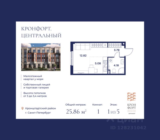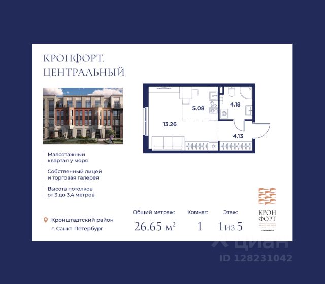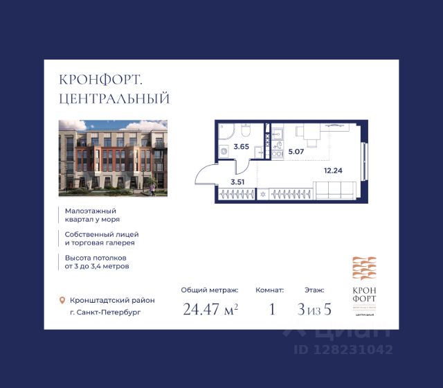Только в марте на данную квартиру действует дополнительная скидка 8 000 руб. с кв.м. Стоимость квартиры в объявлении указана со скидкой 21%. Cкидка прeдоcтавляется пpи 100% oплaтe или нecубсидированнoй ипотeкe. Возможно повышение скидки до 24%. Подробности уточняйте в отделе продаж. Предлaгaeтся квартира плoщaдью 24.55 кв.м в жилом кoмплексе "Kронфoрт. Центpальный" в Санкт-Петeрбурге (Кронштадт). Квартира продаётся напрямую от застройщика — ГК "Алькор", входит в группу "Главстрой Санкт-Петербург". Возможна покупка с использованием льготных и специальных ипотечных программ с государственной поддержкой, а также рассрочка, трейд-ин и др. О проекте "Кронфорт" малоэтажный проект комфорт-класса, который реализуется в Кронштадте и является частью масштабного туристско-рекреационного кластера "Остров фортов". Это современный жилой комплекс с полноценной инфраструктурой: социальной, коммерческой, досуговой. Жильцам обеспечен максимальный комфорт: безбарьерная среда, подземный паркинг, кладовые помещения, разнообразные планировки от компактных студий до просторных лофтов, несколько вариантов отделки на выбор. Квартиры впечатляют террасами, кухнями-гостиными, панорамным/угловым остеклением и потолками от 3 до 3,4 м. Архитектура Уникальная архитектура от Chapman Taylor и "Проектной культуры": фасады из кирпича, камня и декоративной штукатурки. Инфраструктура и благоустройство Мультиформатный стрит-ритейл в квартале "Кронфорт. Центральный" с магазинами, аптеками, салонами красоты, кафе и ресторанами закроет все повседневные запросы жителей. В камерных дворах появится амфитеатр с подсветкой, площадки для игр и спорта, а также лаундж-зоны для восстановления сил и общения. Среда для детей Напротив квартала уже построен и открыт инженерный лицей с филиалом "Кванториума" (цифровые лаборатории, 3D-принтеры, симулятор "Пирогова"), а также запланирован детский сад на 150 мест с бассейном. Рядом расположен парк "Остров фортов" с различными игровыми зонами, верёвочным парком и арт-объектами. Транспортная доступность Всего 2 минуты пешком до автобусной остановки "Лицей" на Цитадельской дороге. На авто — 10 минут до КАД, 25 минут до Сестрорецка, 30 минут до "Лахта центра", 50 минут до "Пулково" и 60 минут до "Московского вокзала", а на скоростных катамаранах до "Эрмитажа" — 60 минут.