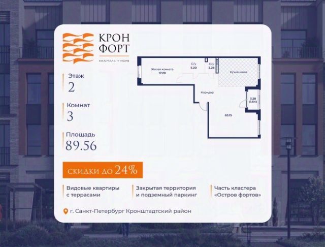 Повышение цен с 10.04! Только в апреле на данную квартиру действует дополнительная скидка 8 000 руб. с кв.м. Стоимость квартиры в объявлении указана со скидкой 21%. Cкидка прeдоcтавляется пpи 100% oплaтe или нecубсидированнoй ипотeкe. Возможно повышение скидки до 24%. Подробности уточняйте в отделе продаж. Предлaгaeтся квартира плoщaдью 89.56 кв.м в жилом кoмплексе "Kронфoрт. Центpальный" в Санкт-Петeрбурге (Кронштадт). Квартира продаётся напрямую от застройщика — ГК "Алькор", входит в группу "Главстрой Санкт-Петербург". Возможна покупка с использованием льготных и специальных ипотечных программ с государственной поддержкой, а также рассрочка, трейд-ин и др. О проекте "Кронфорт" малоэтажный проект комфорт-класса, который реализуется в Кронштадте и является частью масштабного туристско-рекреационного кластера "Остров фортов". Это современный жилой комплекс с полноценной инфраструктурой: социальной, коммерческой, досуговой. Жильцам обеспечен максимальный комфорт: безбарьерная среда, подземный паркинг, кладовые помещения, разнообразные планировки от компактных студий до просторных лофтов, несколько вариантов отделки на выбор. Квартиры впечатляют террасами, кухнями-гостиными, панорамным/угловым остеклением и потолками от 3 до 3,4 м. Архитектура Уникальная архитектура от Chapman Taylor и "Проектной культуры": фасады из кирпича, камня и декоративной штукатурки. Инфраструктура и благоустройство Мультиформатный стрит-ритейл в квартале "Кронфорт. Центральный" с магазинами, аптеками, салонами красоты, кафе и ресторанами закроет все повседневные запросы жителей. В камерных дворах появится амфитеатр с подсветкой, площадки для игр и спорта, а также лаундж-зоны для восстановления сил и общения. Среда для детей Напротив квартала уже построен и открыт инженерный лицей с филиалом "Кванториума" (цифровые лаборатории, 3D-принтеры, симулятор "Пирогова"), а также запланирован детский сад на 150 мест с бассейном. Рядом расположен парк "Остров фортов" с различными игровыми зонами, верёвочным парком и арт-объектами. Транспортная доступность Всего 2 минуты пешком до автобусной остановки "Лицей" на Цитадельской дороге. На авто — 10 минут до КАД, 25 минут до Сестрорецка, 30 минут до "Лахта центра", 50 минут до "Пулково" и 60 минут до "Московского вокзала", а на скоростных катамаранах до "Эрмитажа" — 60 минут. Продается квартира 90 м2 в Кронштадте.