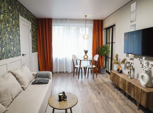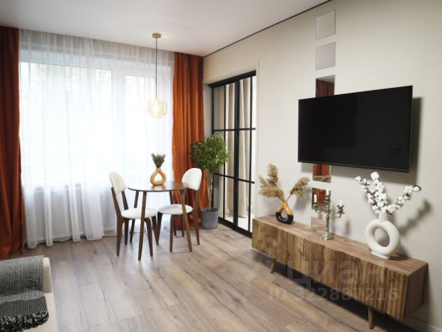 Кухня и гостиная разделены стеклянными дверями, в гостиной раскладной диван, подвесной смарт ТВ, тв тумба, деревянный обеденный стол, деревянные стулья, дер. журнальный стол, рабочий стол, рабочее стул-кресло.