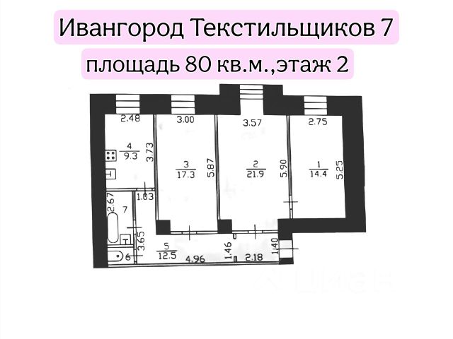 Продается очень светлая и невероятно просторная 3-комнатная квартира 80 кв.м. на 2 этаже в кирпичном доме по адресу: Ивангород, ул. Текстильщиков, д. 7. Главные преимущества: Идеальный вариант для большой семьи: просторные комнаты и большая площадь вспомогательных помещений обеспечат комфорт всем членам семьи. Огромный потенциал: Квартира находится в обычном, жилом состоянии — это чистый холст для вашей фантазии. Можно сделать современный ремонт под свои нужды без необходимости переделывать чужой. Уникальная планировка с высокими потолками 3.3 м! Ощущение простора и свободы. Много света. Кухня: 9.3 м², комнаты: 17.3 м², 21.9 м² и 14.4 м² — можно легко организовать и общую зону и личное пространство для каждого. Большой коридор: 12.5 м² — можно обустроить гардеробную или систему хранения. Спокойный район. Дом расположен в тихом районе "Парусинка". Состояние: Квартира в жилом, обычном состоянии. Требуется косметический или капитальный ремонт по вашему вкусу. Санузел раздельный. Документы: Документы на собственность соответствуют требованиям законодательства РФ. Условия продажи - встречная покупка. Особенности Ивангорода: Город находится в приграничной зоне, пропускной режим. Дополнительный вопросы можно задать по телефону с 10/00 до 18/00 в рабочие дни, в остальное время пишем в чат.