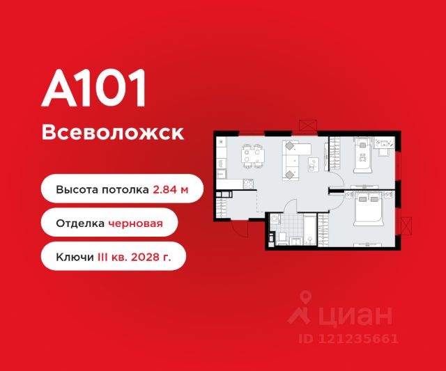 2-комнатная квартира площадью 56.80 в ЖК "А101 Всеволожск" на 4 этаже. Квартира без отделки. Вид из окна на улицу. В квартире 1 санузел. Высота потолков 2.84 м. ОТДЕЛКА Квартира передается без отделки. Благодаря тому, что в данном типе отделки стены не возводятся, вы сможете создать удобную планировку и самостоятельно организовать зонирование комнат. ДВОРЫ И ОКРУЖЕНИЕ Большая часть территории комплекса отведена под зелёные благоустроенные зоны: теневые сады, уютные городские пространства с развитой тротуарной сетью и велодорожками - всё для вашего активного и здорового образа жизни. Внутренние дворы закрыты от посторонних и свободны от автомобилей. Каждый дом оснащён высокотехнологичными системами видеонаблюдения и контроля доступа, обеспечивая максимум безопасности и спокойствия для вас и ваших близких. Окружение района - живописный природный ландшафт. Всего в 5 минутах ходьбы располагается Ковалёвский лесопарк - источник кислорода, пространство для спорта, отдыха и приятных прогулок на свежем воздухе. ПАРАДНАЯ Мягкая мебель, живые растения и натуральные материалы в отделке формируют современный и уютный интерьер входной группы, радующий глаз и создающий приятную атмосферу для встреч с гостями. Для вашего удобства реализован безбарьерный вход, отвечающий требованиям доступной среды для всех жильцов, а также в каждой парадной имеется отдельное помещение для хранения колясок и велосипедов. ИНФРАСТРУКТУРА: В жилой застройке сохранена естественная среда благодаря разнообразию растительности, извилистым дорожкам и уличной мебели из натуральных материалов. Здесь находится насыщенная сеть экотроп протяжённостью более 10 км прямо у дома, а просторная площадь позволяет жителям приятно провести время, общаться с соседями и отдыхать. Также предусмотрены зоны для отдыха и специально оборудованные спортивные площадки для активного образа жизни на свежем воздухе. На территории района ГК "А101" создает современный учебно-образовательный кластер, В "А1О1 Всеволожск" предусмотрена современная школа на 1300 учеников и 2 детских сада Всё самое необходимое - рядом с вашим домом. Выпить утром кофе в уютном кафе или поужинать с друзьями, отвести детей на развивающие занятия или игровую площадку, купить продукты и товары первой необходимости. В проекте запланировано уникальное гастрономическое пространство, располагающееся на основном пешеходном бульваре жилого района. Территория дополнительно оборудована местами отдыха на свежем воздухе, а для ресторанов и кафе будет предусмотрена возможность организации летних веранд. ЗАСТРОЙЩИК: ГК "А101" - один из крупнейших застройщиков России. Каждая восьмая квартира, проданная в Москве, находится в районе, построенном компанией, что подчеркивает её значимость и успех на рынке недвижимости.
