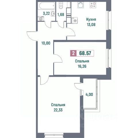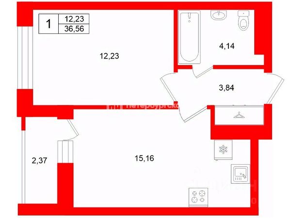 Общая площадь квартиры 34.7 кв.м. + балкон - 4.1 кв.м, комната 16.9 кв.м, кухня 10.4 кв.м, прихожая 3.4 кв.м, площадь санузла 4 кв.м.