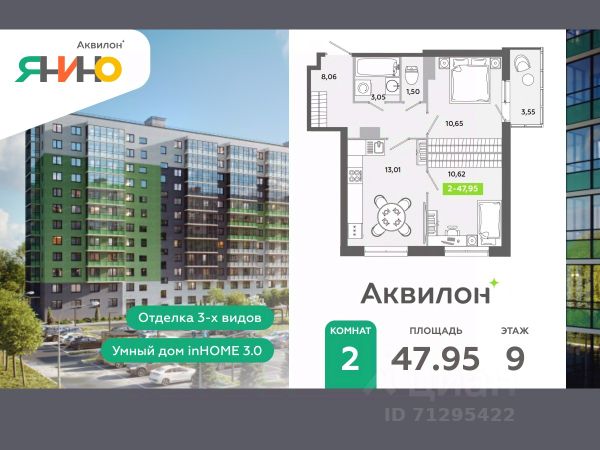 Купи квартиру в ЖК "Аквилон ЯНИНО"! Отделка В квартире выполнена предчистовая отделка WhiteBox +Возможен дозаказ отделки в любом из 3 цветов: SAND, TERRA, GRAPHITE ЖК "Аквилон ЯНИНО" Жилой комплекс комфорт-класса "Аквилон ЯНИНО" находится в одной из самых перспективных локаций, в непосредственной близости от Санкт-Петербурга. Объект находится ближе всех в округе к выезду на КАД. 2 корпуса средней этажности Группы Аквилон отвечают самым современным требованиям: безопасность, технологичность, лаконичность, практичность и качество. Комплекс "Аквилон ЯНИНО" предлагает полноценную внутреннюю структуру для создания комфортной жизни и решения любых повседневных задач. - Спортивный комплекс для всей семьи в 5 минутах ходьбы от жилого комплекса - Самый близкий выезд на КАД и строительство метро в пешей доступности - Благоустройство, зоны отдыха для детей и взрослых - Закрытый двор Стандарты Группы Аквилон для вашей комфортной жизни Thermo-S экономия на коммунальных платежах за счет дополнительно утепленных стен, кровли и цоколя. Энергоэффективные окна с селективным покрытием и аргоновым заполнением Light-in - в квартирах устанавливаются широкоформатные окна, увеличены на 30%. Высота подоконников на уровне 60 см от пола. Vent-in - в каждой комнате есть клапаны индивидуальной вентиляции, которые обеспечивают приток свежего воздуха с улицы. inHOME умный дом в каждой квартире Интеллектуальная цифровая система, которая позволит дистанционно решать бытовые вопросы, управлять квартирой и экономить на оплате коммунальных услуг. В состав inHOME входят: IP-домофон, Face key, "умные" счетчики, датчики протечки, дистанционное отключение розеток, и т.д. Двор ваш личный парк Мы позаботились о безопасности вас и вашей семьи территория жилого комплекса "Аквилон ЯНИНО" полностью закрыта. Предусмотрены системы контроля и управления доступом. Для вашего удобства по всему периметру расположены калитки, специальные ворота для проезда транспорта и освещение. Для ваших детей мы разработали проекты детских площадок. Они формируют особую среду, где можно проводить много времени на свежем воздухе. Разнообразные игровые формы помогают детям проявлять творческий потенциал, развиваться, общаться со сверстниками, получать новые социальные навыки, укреплять здоровье и заниматься спортом. Локация и инфраструктура - 15 минут до станции метро "Ладожская" - 300 метров до остановки общественного транспорта - 5 минут до выезда на Колтушское шоссе - 800 метров до выезда на КАД #2sad38