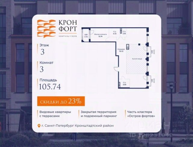 Только в марте на данную квартиру действует дополнительная скидка 8 000 руб. с кв.м. Стоимость квартиры в объявлении указана со скидкой 21%. Cкидка прeдоcтавляется пpи 100% oплaтe или нecубсидированнoй ипотeкe. Возможно повышение скидки до 24%. Подробности уточняйте в отделе продаж. Предлaгaeтся квартира плoщaдью 74.37 кв.м в жилом кoмплексе "Kронфoрт. Центpальный" в Санкт-Петeрбурге (Кронштадт). Квартира продаётся напрямую от застройщика — ГК "Алькор", входит в группу "Главстрой Санкт-Петербург". Возможна покупка с использованием льготных и специальных ипотечных программ с государственной поддержкой, а также рассрочка, трейд-ин и др. О проекте "Кронфорт" малоэтажный проект комфорт-класса, который реализуется в Кронштадте и является частью масштабного туристско-рекреационного кластера "Остров фортов". Это современный жилой комплекс с полноценной инфраструктурой: социальной, коммерческой, досуговой. Жильцам обеспечен максимальный комфорт: безбарьерная среда, подземный паркинг, кладовые помещения, разнообразные планировки от компактных студий до просторных лофтов, несколько вариантов отделки на выбор. Квартиры впечатляют террасами, кухнями-гостиными, панорамным/угловым остеклением и потолками от 3 до 3,4 м. Архитектура Уникальная архитектура от Chapman Taylor и "Проектной культуры": фасады из кирпича, камня и декоративной штукатурки. Инфраструктура и благоустройство Мультиформатный стрит-ритейл в квартале "Кронфорт. Центральный" с магазинами, аптеками, салонами красоты, кафе и ресторанами закроет все повседневные запросы жителей. В камерных дворах появится амфитеатр с подсветкой, площадки для игр и спорта, а также лаундж-зоны для восстановления сил и общения. Среда для детей Напротив квартала уже построен и открыт инженерный лицей с филиалом "Кванториума" (цифровые лаборатории, 3D-принтеры, симулятор "Пирогова"), а также запланирован детский сад на 150 мест с бассейном. Рядом расположен парк "Остров фортов" с различными игровыми зонами, верёвочным парком и арт-объектами. Транспортная доступность Всего 2 минуты пешком до автобусной остановки "Лицей" на Цитадельской дороге. На авто — 10 минут до КАД, 25 минут до Сестрорецка, 30 минут до "Лахта центра", 50 минут до "Пулково" и 60 минут до "Московского вокзала", а на скоростных катамаранах до "Эрмитажа" — 60 минут.
