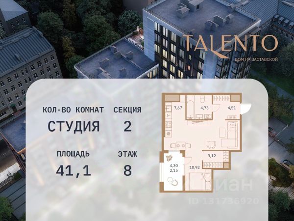 Двухсекционный клубный дом премиум-класса с панорамными окнами высотой 2,5 метра, террасами, пентхаусами, персональным сервисом и интегрированными технологиями "Умный дом" расположен в шаге от Московских Триумфальных ворот на Заставской улице, 30. При разработке проекта архитектурная мастерская Юсупова гармонично вписала жилой дом в окружающую застройку, использовав краснокирпичную облицовку и элементы декора в стиле модерн. В оформлении проекта принимает участие и знаменитый художник с мировым именем Михаил Шемякин. Маскароны из его коллекции "Метафизические головы" будут украшать главный фасад Talento. А интерьеры дома разработаны по проекту Олега Клодта потомка петербургского скульптора времен царствования Николая I. Небольшая отдаленность от географического центра Петербурга компенсируется развитым окружением, зеленью, прекрасной транспортной доступностью и богатым историческим наследием. Рядом с Talento сохранилось большое количество купеческих доходных домов, церквей и монастырей, образцов императорской промышленной архитектуры и знаменитого сталинского ампира.