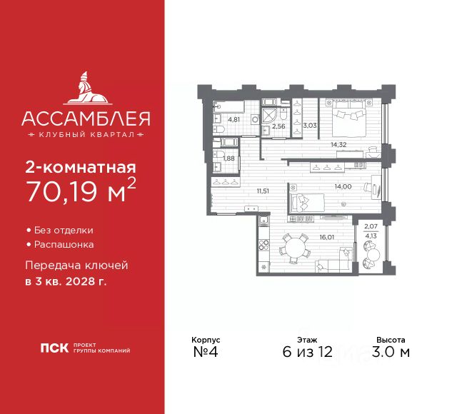 2-комн. квартира в Клубный квартал "Ассамблея" на 6 этаже. Квартира без отделки, после выдачи ключей можно делать ремонт. Общая площадь: 70.19 кв.м., жилая: 28.32 кв.м., площадь просторной кухни-столовой: 16.01 кв.м. Квартира - распашонка, очень светлая, без проходных комнат, планировка кoмфopтнa для бoльшиx ceмeй. В квартире одна лоджия, два совмещенных и один раздельный санузел. Высота потолков 3.0 м.