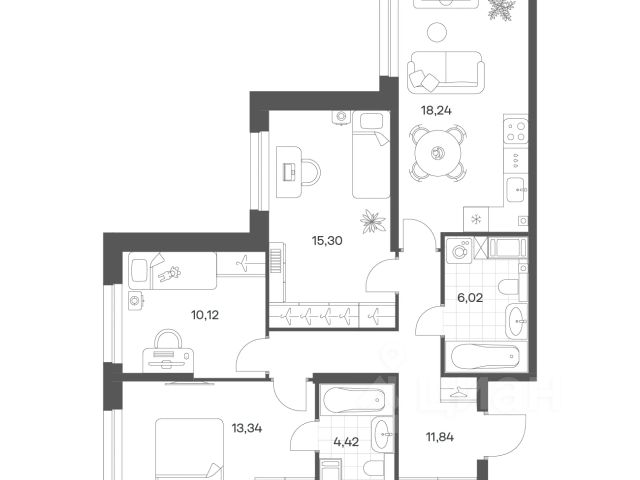 Продается квартира площадью 79.28 м² на 3 этаже 1 секции в Речной квартал от компании ГК "ТРЕСТ". Площадь кухни 18.24 м². Семейный жилой комплекс комфорт-класса "Речной квартал" от Группы компаний "ТРЕСТ" расположен в Невском районе Петербурга на пересечении Октябрьской набережной и Русановской улицы. Первая очередь квартала состоит из трёх корпусов, расположенных лучеобразно, чтобы максимально использовать естественное освещение и обеспечить видовые точки на локацию. Проект выделяется современными архитектурными решениями и дизайном. Концепция развития и благоустройства придомовой территории разделена на зоны отдыха, досуга и игровые площадки с учетом возраста и потребностей детей и взрослых. Квартал рассчитан на семейных покупателей, поэтому здесь нет студий: только одно-, двух- и трёхкомнатные квартиры. В проекте представлены квартиры с кухнями-гостиными, мастер-спальнями, гардеробными и кладовыми. "Речной квартал" - современный жилой комплекс с разнообразным благоустройством придомовой территории, просторными европланировками, закрытой охраняемой территорией и подземными паркингами. На территории комплекса уже функционирует детский сад на 110 мест. Также в квартале будет построена общеобразовательная школа на 475 мест с бассейном и стадионом. Открытие школы запланировано на 2029 год. Квартиры в ЖК "Речной квартал" можно приобрести с готовой отделкой от застройщика. Для покупателей квартир предусмотрено два варианта чистовой отделки "Ваниль" и "Шоколад". Чистовая отделка в квартирах ЖК "Речной квартал" предполагает монтаж натяжных потолков, укладку ламината, оклейку стен обоями под покраску, установку светильников и межкомнатных дверей. При отделке новой квартиры применяются качественные, натуральные и экологичные материалы, монтируется стильная импортная сантехника европейских брендов. Застройщик АО "Специализированный застройщик "Строительный трест".