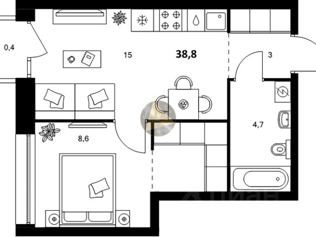 1-комн. квартира от застройщика в Клубный квартал "Ассамблея" на 7 этаже. Квартира без отделки, полностью готова к чистовой отделке и дальнейшему ремонту. Общая площадь: 35.95 кв.м., жилая: 10.37 кв.м., площадь просторной кухни-столовой: 15.68 кв.м. Все окна выходят на одну сторону. В квартире одна лоджия, один совмещенный санузел. Высота потолков 3.0 м.