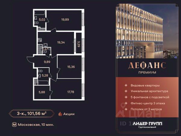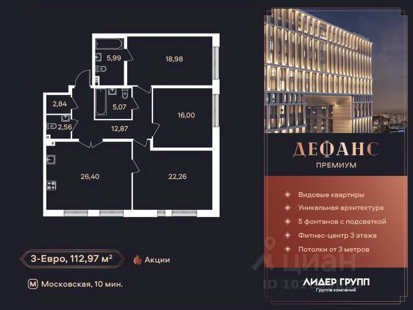 ЖК "Дефанс Премиум". Строительство завершено. Дом получил заключение о соответствии и готовится к вводу! Это проект авторской архитектуры с уникальными форматами квартир в 10 минутах ходьбы от станции метро "Московская". Дом выполнен в виде двух 23-х этажных арок, основания которых объединены единым внутренним пространством с большой парадной лестницей, променадом и большим фонтанным комплексом с подсветкой. В составе проекта построен большой фитнес-центр с бассейнами и зоной СПА. Часть квартир отделена от остальных жилых этажей специальным техническим этажом — это снимает все ограничения по перепланировке. Для части квартир предусмотрены индивидуальные входные группы и дополнительные лифты премиального немецкого бренда Tyssen Krupp (TKE). Фасады, облицованные испанской керамикой и алюминиевые панорамные окна с энергоэффективными стеклами AGС Energy подчеркивают высокий статус дома. На квартиры ЗПИФ и переуступки семейная ипотека не распространяется!