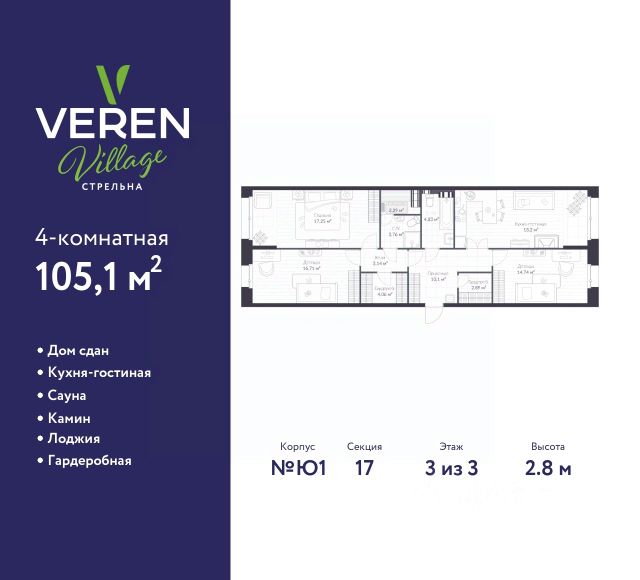 Спешите забронировать, пока действует скидка! Предложение ограничено! Стоимость квартиры указана со скидкой, ваша экономия составит 2,683,800 RUB. Звоните, мы вам все подробно расскажем! Просторная 3-комн. квартира в ЖК "VEREN VILLAGE Стрельна" на 3 этаже. Квартира без отделки, новый собственник может сделать ремонт по индивидуальному проекту. Общая площадь: 99.4 кв.м., жилая: 39.25 кв.м., площадь просторной куxни-гостиной: 32.17 кв.м. Угловая квартира, окна oбecпeчивaют paвнoмepнoe ocвeщeниe в тeчeниe дня. В квартире два балкона, два совмещенных санузла. Высота потолков 2.8 м. Дом монолитный, двухподъездный, высотой 3 этажа. Квартира находится в 1-й секции в корпусе Южный 1. В подъезде 1 грузовой лифт. На сегодняшний день строительство завершено, дом сдан во 2 квартале 2022 года. Оформление сделки по договору купли-продажи. Веранда, куxня-гостиная, камин, сауна, мастер-спальня. VEREN VILLAGE Стрельна - малоэтажный жилой комплекс бизнес-класса, расположенный в престижном Петродворцовом районе Санкт-Петербурга. Рядом с комплексом находится Константиновский дворец (всего 800 метров), до Финского залива - 1,5 км. Исторической окружение, чистый воздух уютного зеленого района, озеро с благоустроенной набережной на закрытой территории комплекса, собственный спортивно-оздоровительный комплекс с плавательным бассейном - все это делает жизнь в VEREN VILLAGE спокойной и уютной, максимально приближенной к загородной. А до КАД можно добраться за 5 минут. Все дома на территории - трехэтажные, во дворе каждого из них высажены деревья разных пород, в каждом дворе своя. Трёхэтажные дома VEREN VILLAGE стрельна не закрывают от вас солнце и звёзды. Вдоль главной дороги комплекса - светлая сосновая аллея. Центральная площадь выходит на озеро, вдоль которого оборудована прогулочная набережная с велосипедными дорожками. Для отдыха устроены рыбацкий мостик и деревянная палуба-пляж - личный курорт для жителей VEREN VILLAGE стрельна. На каждом этаже находится не более 6 квартир. Архитектурный облик комплекса, разработанный знаменитым бюро "Остоженка" заслуживает особого внимания. При отделке фасадов домов применяется долговечный и эффектный кирпич ручной формовки. Все стильные парадные исполнены по авторскому дизайн-проекту с использованием натуральных материалов. Несмотря на малоэтажность, в парадных предусмотрены лифты. Ландшафтный дизайн разделил все пространство комплекса на тихие прогулочные зоны и места для активного отдыха. Вся территория VEREN VILLAGE закрыта и охраняется. Для автомобилей жильцов предусмотрен подземный паркинг. Аккредитация в банках: ОАО "Альфа-Банк", "Сбербанк России", ПАО "Газпромбанк", ПАО Банк "ВТБ", АО "Райффайзенбанк" и других. #zwCdSv