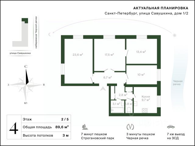 В продаже трёхкомнатная двухсторонняя квартира 53,6 м.кв., в пешей доступности от метро Чёрная речка.