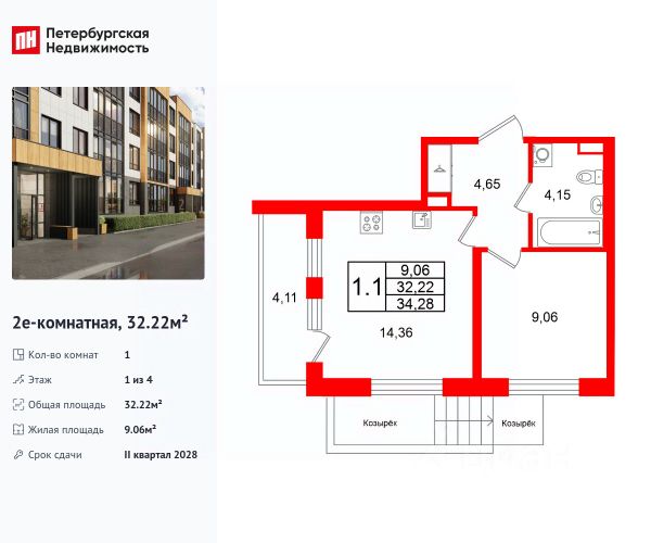 Площадь квартиры 18.20 + балкон 3.60 кв.м. в Шушарах, в развитом и престижном районе СПб