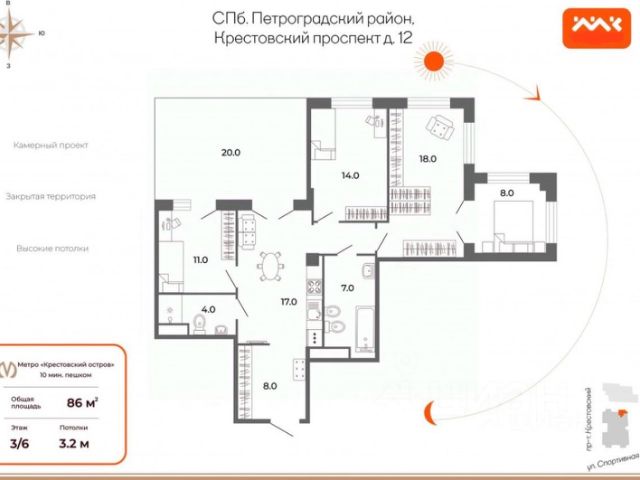 "Фаворит" - единственный жилой комплекс с индивидуальным выходом в Приморский парк Победы, возведен в самой живописной и обособленной части Крестовского острова на набережной Малой Невки. Благоустроенная собственная территория комплекса занимает 2,5 Га и является продолжением парка. Предлагается к продаже трехсторонняя квартира площадью 173 кв. м с идеальной планировкой и панорамными видами на парковую зону, современные архитектурные доминанты и Малую Невку. Планировочные и интерьерные решения привносят гармонию, покой и порядок. Гостиная 50 кв. м, объединенная с кухней, зонирована на пространство для комфортного семейного отдыха, обеденную зону и зону приготовления (техника AEG, Liebherr). Приватная часть представлена блоком с четырьмя спальнями, двумя ванными комнатами и гардеробной. При входе в квартиру - холл со стеклянной дверью с контролем доступа, просторный хоз. блок и гостевой санузел с интерьером по мотивам живописи австрийского художника Хундертвассера. Неповторимый индивидуальный характер интерьера задают акцентные предметы мебели и декора на фоне естественной гаммы оттенков. Деликатные мотивы волшебных детских сказок наполняют жилое пространство атмосферой комфорта и благополучия. Поддерживает лейтмотив и помогает достичь внутреннего баланса welness-комната с ванной и панорамным эркером. Жилое пространство способно стать местом силы - начать и закончить день в гармонии с собой. "Есть только два способа прожить жизнь. Первый будто чудес не существует. Второй будто кругом одни чудеса" (Альберт Эйнштейн). Для максимального комфорта: система кондиционирования, автономная газовая котельная, система очистки воды, бесшумный лифт KONE, подземный паркинг, просторный двор с ландшафтным дизайном, фонтаном и детской площадкой, безопасность обеспечивает проф. служба охраны. "Фаворит" - клубный формат, сочетающий активность мегаполиса с размеренным ритмом жизни. Купить квартиру - элитное жильё на проспекте Крестовский в Санкт-Петербурге.
