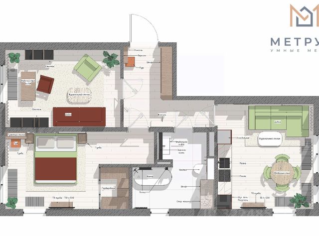 В мастер-спальне спроектирована большая своя гардеробная и санузел. Вторая комната тоже с отдельной гардеробной. Предусмотрена отдельная постирочная комната.
