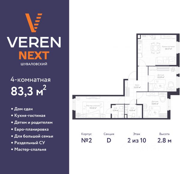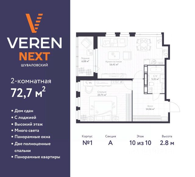 Торопитесь забронировать на этих условиях! Предложение ограничено! Стоимость квартиры указана со скидкой, ваша экономия составит 2,100,222 RUB. Звоните, наши менеджеры вам все расскажут! Продается двухкомнатная квартира в ЖК "VEREN NEXT Шуваловский" на 10 этаже. Квартира без отделки, новый владелец может сделать ремонт по своему проекту. Общая площадь: 72.7 кв.м., жилая: 35.12 кв.м., площадь кухни: 5 кв.м. Квартира угловая, окна oбecпeчивaют paвнoмepнoe ocвeщeниe в тeчeниe дня. В квартире одна лоджия, один совмещенный санузел. Высота потолков 2.8 м. Квартира будет сдана без отделки. Установлены стеклопакеты с повышенной тепло- и шумоизоляцией, установлены элементы отопления, входная дверь, заведены все коммуникации. Вы сможете реализовать свои самые смелые планы дизайн-проекта. Дом монолитный, двухподъездный, высотой 10 этажей. Квартира находится в 1-й секции в корпусе 1. В подъезде 1 грузовой лифт. Начало строительства - 4 квартал 2019 года. Строительство завершено, дом сдан в 3 квартале 2023 года. Оформление сделки по договору купли-продажи. С лоджией, панорамные окна, высокий этаж, много света , вид на приватный двор. ЖК "VEREN NEXT шуваловский" - жилой комплекс комфорткласса, расположенный в Приморском районе Санкт-Петербурга. Дома с выразительной авторской архитектурой от именитого бюро "Студия 44". Смело сочетая материалы и формы, архитекторы разработали эффектный и запоминающийся проект, который разительно отличается от представленных в окружении. Отделка фасадов отдаёт дань одновременно и традициям, и трендам. На каждом этаже находится не более 7 квартир. Наши специалисты разработали 47 различных типов планировочных решений, каждое из которых продумано с учетом требований эргономики и функциональности, где нет бесполезной площади. Общее для всех вариантов — увеличенные оконные проемы, а во многих комнатах сразу по два окна, что обеспечивает естественное освещение и ощущение простора. На верхних этажах располагаются квартиры с панорамным остеклением. Ещё больше света и панорамных видов — для тех, кто ценит красоту каждого дня! Красивые парадные с витражным остеклением созданы по индивидуальному дизайн-проекту. В приватном благоустроенном дворе VEREN NEXT Шуваловский найдется место и для детских игр, и для спортивных тренировок на свежем воздухе, и для спокойного отдыха. Пространство здесь спланировано так, чтобы взрослые и малыши проводили время с комфортом. На территории комплекса предусмотрен собственный детский сад. Этот дом красив снаружи и комфортен изнутри. Правильное благоустройство и зонирование позволят каждому жильцу дома комфортно проводить свой досуг. Доступ на территорию комплекса закрыт, а пропускная система позволяет почувствовать себя дома ещё до того, как вы поднимитесь в квартиру. Здесь есть всё, чтобы сэкономить время: магазины, кафе, разнообразные бытовые услуги, подземный паркинг, колясочные и кладовые. ЖК "VEREN NEXT шуваловский" расположен в одной из самых востребованных новоселами локац Продается квартира элитные на улице Парашютная в Санкт-Петербурге.