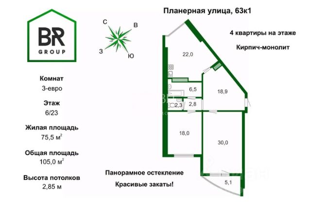 Преимущества квартиры:Просторная 3-евро квартира 105 м2!Свободная планировка, возможность спроектировать планировку по своему дизайну!Большая просторная кухня-гостиная 22 кв. м., мечта любой хозяйки!Просторные жилые комнаты 30 кв. м и 18 кв. м правильной прямоугольной формы, с возможностью организовать гардеробную, комната с гардеробной!Панорамное остекление в пол в Кухне-гостиной и большой комнате!Остекление полностью заменено на теплое!ВИДОВАЯ КВАРТИРА! Из окон открывается красивый вид на шикарные закаты, на Лахта центр, Юнтоловский заказник! Окна на улицу на парковую зону и во двор,Просторная прихожая 18 кв.м. Просторная прихожая это редкость в современных планировках, позволяет организовать пространство удобным для Вас способом с местом для хранения! гардеробной! или даже спальней или зоной отдыха,Просторные санузлы, возможность организовать 2 раздельных санузла!В квартире произведена разводка электрикиВ квартире предусмотрена возможность установки перегородок, дополнительного зонированияквартира продается без отделкиПреимущества дома:Кирпично-монолитный качественный дом 2010 года от хорошего застройщика!НА этаже ВСЕГО 4 КВАРТИРЫ! Это значит будет тихо и чисто!хорошие соседи!КРАСИВЫЙ ДОМ с архитектурной точки зрения!Хорошие лифты пассажирский и грузовой,видеонаблюдение в лифтах и по периметру дома,Удобная транспортная доступность до центра города и в любой район! до метро Комендантский проспект 10 мин на транспортерядом выезд на ЗСД, что позволяет быстро добраться в любую точку города, и быстро выехать за город,Во дворе подземный паркинг, и открытая парковкав пешей доступности: школы, детские сады, пекарни, магазины, автобусные остановки и большой ТЦ "Монпансье". Также в самом доме есть галерея с магазинами,Во дворе детская площадкаРядом парк, прогулочные тропы, река, здесь устраивают пикники, катаются на велосипедах, роликах, зимой на ватрушках и коньках!В районе также отличные парки, 15 минут на машине: парк 300-летия Санкт-Петербурга, ЦПКиО, парк Озеро Долгое, Юнтоловский заказник, Непосредственно Рядом с домом отличное место для отдыха и прогулок!ДОКУМЕНТЫ:В Собственности более 5 лет, покупали у ЗастройщикаБез обременений, Мат кап не использовался, без ипотекиникто не прописан1 взрослый собственникготовность к сделкевся сумма в договореБезопасная сделка в сопровождении