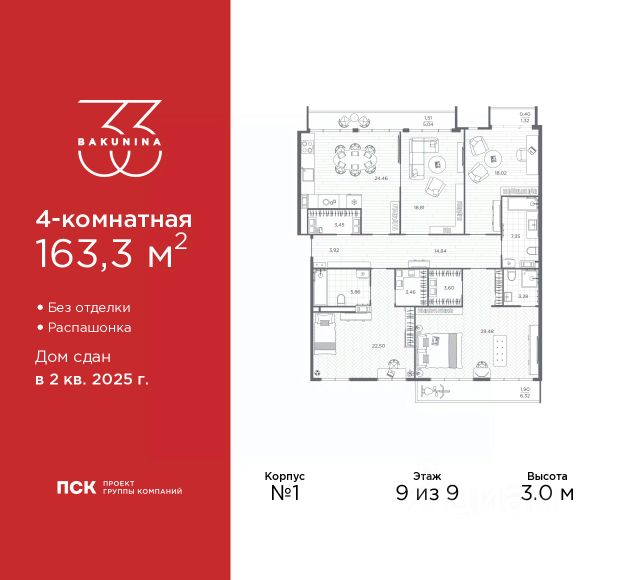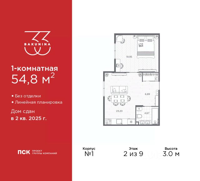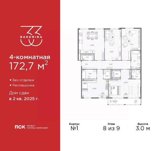 Просторная двухкомнатная квартира в ЖК "BAKUNINA 33" на 3 этаже. Квартира без отделки, полностью готова к ремонту. Общая площадь: 72.9 кв.м., жилая: 35.11 кв.м., площадь просторной кухни-столовой: 15.36 кв.м. Квартира - распашонка, без проходных комнат, окна выходят на paзные стороны дома. В квартире одна лоджия, один совмещенный и один раздельный санузел. Высота потолков 3.0 м. Дом монолитный, трехподъездный, высотой 9 этажей. Квартира находится в 1-й секции в корпусе 1. На этаже 7 квартир. В подъезде 1 пассажирский и 1 грузовой лифт. Начало строительства - 2 квартал 2023 года. Строительство окончено, дом сдан во 2 квартале 2025 года. Оформление сделки по договору купли-продажи. В шаговой доступности от дома имеются станции метро (расстояние по прямой): "Площадь Александра Невского" (700 м), "Площадь Александра Невского 1" (700 м), "Площадь Александра Невского 2" (800 м), "Площадь Восстания" (1.4 км), "Новочеркасская" (1.5 км), также недалеко от этого корпуса расположены станции метро: "Владимирская", "Чернышевская", "Ладожская". Клубный дом BAKUNINA 33 - новый стандарт престижной жизни в Центральном районе. В 10 минутах от Невского проспекта и в двух минутах от Синопской набережной и Невы, в благоустроенной и знакомой среде. Локация клубного дома Bakunina 33 - идеальное место для погружения в культурную и светскую жизнь Санкт-Петербурга. В 10-15 минутах на машине почти все знаковые достопримечательности города: Эрмитаж, Русский музей, Александринский и Мариинский театры, БДТ, Таврический парк Казанский собор, Спас на крови и другие величественные дворцы, соборы, музеи, ради которых в город ежегодно съезжаются тысячи гостей. Каждая линия и каждый элемент дизайна дома является частью целостной концепции. Облик здания гармоничный, классически сдержанный с выверенными пропорциями и элегантными формами. Цветовые и архитектурные решения и эркеры придают облику дома легкость, доступную лишь респектабельной классике. Фасады привлекают внимание плавными ритмичными переходами. Вертикальная разбивка колоннами визуально устремляет здание ввысь. Плоскость фасадов декорирована разными элементами из гранита. Ограждение балконов, эркеры и колонны дополнены лаконичным геометрическим орнаментом в акцентном теплом сером цвете. Первые два этажа дома облицованы натуральным гранитом тёмного оттенка. Основной объём здания - выполнен штукатурным фасадом с окраской светлыми тонами из цветовой палитры " Традиционные цвета Санкт-Петербурга". Верхний этаж выполнен в стиле мансарды с высотой потолков в квартирах 3,5 метра. Этим достигается цель гармоничного и сомасштабного существования в одном фронте с существующими зданиями. За венчающим карнизом располагаются балконы девятого этажа. Ограждения балконов дополнены геометрическими узорами. Закрытый внутренний двор со сквером и детской площадкой. Острова зелени с водной чашей в центре создают ощущение гармонии и умиротворения. Современная уличная мебель и освещение формируют домашнюю атмосферу уюта и Продается элитная квартира, жильё на проспекте Бакунина в Санкт-Петербурге.