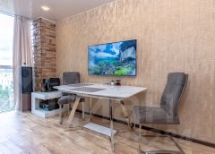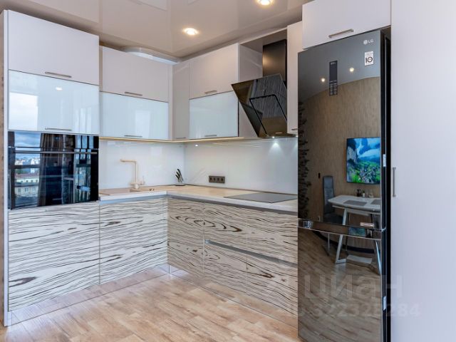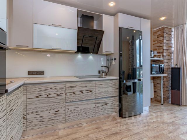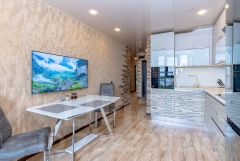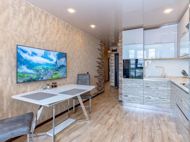 Уютная кухня-гостиная 31,7 м 2 , которая включает в себя кухонную и столовую зоны, а также зону отдыха с выходом на балкон, стена гостиной декорирована крупногабаритным керамогранитом , дизайнерские люстры , установлен декоративный камин -увлажнитель воздуха , кухня с использованием натурального камня и дерева , декорирована лепниной ручной работы , отдельный остров с использованием камня , отдельная гардеробная и постирочная . Теплые полы, кондиционер, коллектор для воды, бойлер.