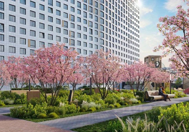 Двор полностью без машин, благоустроен и озеленен: здесь появятся зоны отдыха, детские и спортивные площадки с современным и безопасным покрытием. Все оформлено по авторскому ландшафтному проекту с деревьями, цветниками и кустарниками. Предусмотрены зоны для выгула собак с dog-пакетами. Территория будет закрытой и охраняемой, с системой видеонаблюдения.