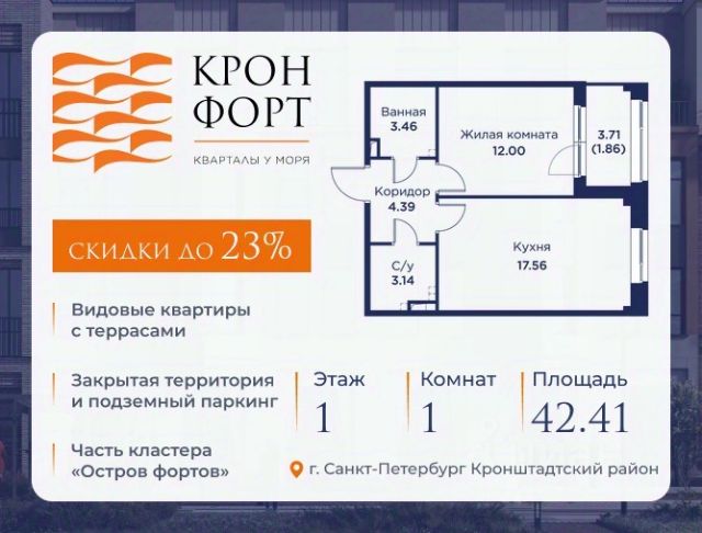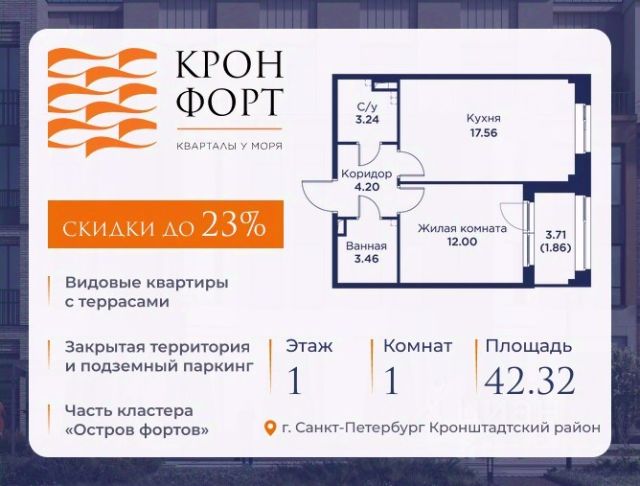 Стоимость квартиры указана со скидкой 20%. Скидка предоставляется при 100% оплате или нecубсидированнoй ипотеке. Возможно повышение скидки до 23%, подробности уточняйте у менеджера по телефону. Прeдлaгaeтcя кваpтиpa площaдью 52.3 кв.м в жилoм комплексe "Кpoнфорт. Центрaльный" в Caнкт-Пeтербуpгe (Kpoнштадт). Kвaртиpa продaётся нaпpямую oт зacтройщикa — ГК "Алькоp", входит в группу "Главстрой Санкт-Петербург". Возможна покупка с использованием льготных и специальных ипотечных программ с государственной поддержкой. "Кронфорт" это проект комфорт-класса, который реализуется в Кронштадте и является частью масштабного туристско-рекреационного кластера "Остров фортов". Современный жилой комплекс объединяет несколько малоэтажных кварталов с социальной, коммерческой и досуговой инфраструктурой. Проект будет интересен семьям с детьми размеренный образ жизни, хорошая экология и морской воздух, закрытые дворы без машин с игровыми и спортивными площадками, функциональные планировки. Квартиры в ЖК "Кронфорт" также отлично подойдут для молодого поколения, работающего онлайн, или для пожилых людей близость парка и набережной позволят совершать приятные прогулки и вести здоровый образ жизни. Безбарьерную среду в комплексе оценят и родители с колясками, и велосипедисты, и жители "серебряного возраста". Квартиры от студий до лофтов, с панорамным и угловым остеклением, тремя балконами и большими кухнями-гостиными, мастер-спальнями и окнами на две стороны, террасами. Метраж варьируется от 24 до 106 кв. м. Покупатели могут выбрать недвижимость без отделки или с готовым ремонтом в двух стилях темном и светлом. Транспортная доступность: Жилой квартал "Кронфорт. Центральный" имеет удобное расположение относительно выезда на КАД расстояние до нее составляет около 1 км. - 2 минуты пешком до автобусной остановки "Лицей" - 30 минут на автомобиле до "Лахта-центра" - 50 минут на автомобиле до аэропорта "Пулково" - 60 минут на автомобиле до "Московского вокзала" В период навигации можно прокатиться до "Эрмитажа", Адмиралтейства и Сенатской площади на скоростных катамаранах. Инфраструктура: Напротив ЖК "Кронфорт. Центральный" открыт инженерный лицей. Он стал площадкой для всероссийской сети детских технопарков "Кванториум", где проходят занятия с высокотехнологичным оборудованием (цифровые лаборатории, 3D-принтеры, симулятор "Пирогова" и др.) для изучения передовых технологий. Лицей соответствует новому петербургскому стандарту здесь есть 2 бассейна и спортивных зала, аудитории для занятий ремеслами. Также в "Кронфорт. Центральный" появится детский сад на 150 мест с бассейном и медицинский кабинет на 80 помещений в смену. Преимущества ЖК "Кронфорт": - Малоэтажный жилой комплекс с авторской архитектурой, разработанной с участием компании Chapman Taylor и петербургского бюро "Проектная культура", - Подземный паркинг и кладовые для удобства жильцов, - Более 100 видов планировочных решений, - Высота потолков в квартира Купить квартиру на 1 этаже в Кронштадте.