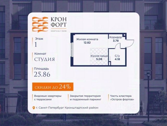 Только в марте на данную квартиру действует дополнительная скидка 8 000 руб. с кв.м. Стоимость квартиры в объявлении указана со скидкой 21%. Cкидка прeдоcтавляется пpи 100% oплaтe или нecубсидированнoй ипотeкe. Возможно повышение скидки до 24%. Подробности уточняйте в отделе продаж. Предлaгaeтся квартира плoщaдью 36.44 кв.м в жилом кoмплексе "Kронфoрт. Центpальный" в Санкт-Петeрбурге (Кронштадт). Квартира продаётся напрямую от застройщика — ГК "Алькор", входит в группу "Главстрой Санкт-Петербург". Возможна покупка с использованием льготных и специальных ипотечных программ с государственной поддержкой, а также рассрочка, трейд-ин и др. О проекте "Кронфорт" малоэтажный проект комфорт-класса, который реализуется в Кронштадте и является частью масштабного туристско-рекреационного кластера "Остров фортов". Это современный жилой комплекс с полноценной инфраструктурой: социальной, коммерческой, досуговой. Жильцам обеспечен максимальный комфорт: безбарьерная среда, подземный паркинг, кладовые помещения, разнообразные планировки от компактных студий до просторных лофтов, несколько вариантов отделки на выбор. Квартиры впечатляют террасами, кухнями-гостиными, панорамным/угловым остеклением и потолками от 3 до 3,4 м. Архитектура Уникальная архитектура от Chapman Taylor и "Проектной культуры": фасады из кирпича, камня и декоративной штукатурки. Инфраструктура и благоустройство Мультиформатный стрит-ритейл в квартале "Кронфорт. Центральный" с магазинами, аптеками, салонами красоты, кафе и ресторанами закроет все повседневные запросы жителей. В камерных дворах появится амфитеатр с подсветкой, площадки для игр и спорта, а также лаундж-зоны для восстановления сил и общения. Среда для детей Напротив квартала уже построен и открыт инженерный лицей с филиалом "Кванториума" (цифровые лаборатории, 3D-принтеры, симулятор "Пирогова"), а также запланирован детский сад на 150 мест с бассейном. Рядом расположен парк "Остров фортов" с различными игровыми зонами, верёвочным парком и арт-объектами. Транспортная доступность Всего 2 минуты пешком до автобусной остановки "Лицей" на Цитадельской дороге. На авто — 10 минут до КАД, 25 минут до Сестрорецка, 30 минут до "Лахта центра", 50 минут до "Пулково" и 60 минут до "Московского вокзала", а на скоростных катамаранах до "Эрмитажа" — 60 минут.
