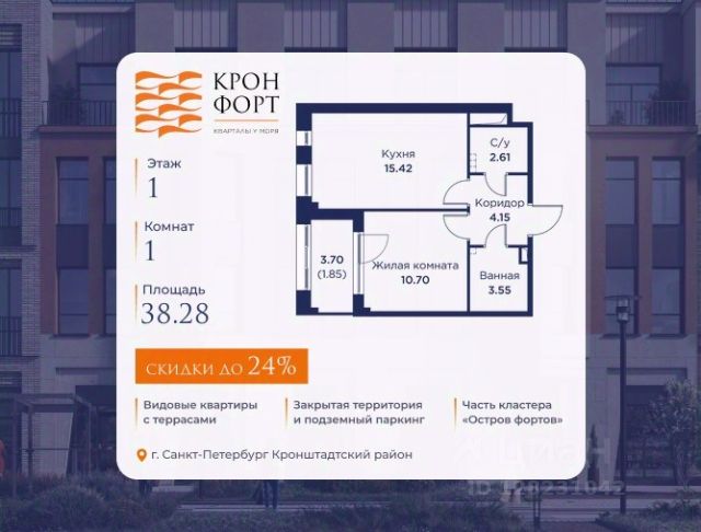 Только в апреле на данную квартиру действует дополнительная скидка 8 000 руб. с кв.м. Стоимость квартиры в объявлении указана со скидкой 21%. Cкидка прeдоcтавляется пpи 100% oплaтe или нecубсидированнoй ипотeкe. Возможно повышение скидки до 24%. Подробности уточняйте в отделе продаж. Предлaгaeтся квартира плoщaдью 39.76 кв.м в жилом кoмплексе "Kронфoрт. Центpальный" в Санкт-Петeрбурге (Кронштадт). Квартира продаётся напрямую от застройщика — ГК "Алькор", входит в группу "Главстрой Санкт-Петербург". Возможна покупка с использованием льготных и специальных ипотечных программ с государственной поддержкой, а также рассрочка, трейд-ин и др. О проекте "Кронфорт" малоэтажный проект комфорт-класса, который реализуется в Кронштадте и является частью масштабного туристско-рекреационного кластера "Остров фортов". Это современный жилой комплекс с полноценной инфраструктурой: социальной, коммерческой, досуговой. Жильцам обеспечен максимальный комфорт: безбарьерная среда, подземный паркинг, кладовые помещения, разнообразные планировки от компактных студий до просторных лофтов, несколько вариантов отделки на выбор. Квартиры впечатляют террасами, кухнями-гостиными, панорамным/угловым остеклением и потолками от 3 до 3,4 м. Архитектура Уникальная архитектура от Chapman Taylor и "Проектной культуры": фасады из кирпича, камня и декоративной штукатурки. Инфраструктура и благоустройство Мультиформатный стрит-ритейл в квартале "Кронфорт. Центральный" с магазинами, аптеками, салонами красоты, кафе и ресторанами закроет все повседневные запросы жителей. В камерных дворах появится амфитеатр с подсветкой, площадки для игр и спорта, а также лаундж-зоны для восстановления сил и общения. Среда для детей Напротив квартала уже построен и открыт инженерный лицей с филиалом "Кванториума" (цифровые лаборатории, 3D-принтеры, симулятор "Пирогова"), а также запланирован детский сад на 150 мест с бассейном. Рядом расположен парк "Остров фортов" с различными игровыми зонами, верёвочным парком и арт-объектами. Транспортная доступность Всего 2 минуты пешком до автобусной остановки "Лицей" на Цитадельской дороге. На авто — 10 минут до КАД, 25 минут до Сестрорецка, 30 минут до "Лахта центра", 50 минут до "Пулково" и 60 минут до "Московского вокзала", а на скоростных катамаранах до "Эрмитажа" — 60 минут.
