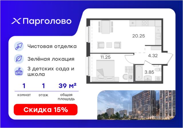 Продается квартира-студия на 1-м этаже в проекте комфорт-класса Парголово. Общая площадь лота составляет 31,37 кв. м, из которых 23,20 кв. м отведено под жилую и кв. м под кухонную зону. Номер квартиры - 4. Преимущества: - Квартира комфорт-класса - Зеленый район, Шуваловский парк в 20 мин. пешком - 10 мин. до КАД, 15 мин. до ЗСД - 5 эт. паркинг на 451 м/м - Закрытые дворы с видеонаблюдением - Детские площадки с геопласткой и бизиборадми - Сады и школы в шаговой доступности - Спортивные площадки и велодорожки - Собственный комьюнити-центр - Келлеры для хранения - Коммерческие помещения на 1 этажах Парголово — масштабный проект комфорт-класса в Выборгском районе Санкт-Петербурга девелопера GloraX. Место, продуманное до мелочей, где все, что необходимо — рядом. Архитектурно-пространственное решение отличается лаконичностью и строгостью и придает проекту свой характер. Внутренние дворы закрыты от внешнего мира, создавая приватную территорию для жителей. Живите на природе, но с комфортом мегаполиса. Десять минут на велосипеде или полчаса пешком — и вы окажетесь в одном из культовых мест отдыха петербуржцев: Шуваловском парке, Орловском заказнике с их чистыми карьерами или на Суздальских озерах. До ж/д станции "Парголово" 7 минут на автомобиле, до метро Проспект Просвещения 25 минут, КАД 10 минут, ЗСД 15 минут. В шаговой доступности остановка общественного транспорта. В шаговой доступности — собственные школы и детские сады. Здесь все создано для максимального комфорта каждого жителя. Приватное пространство внутреннего двора с беседками с розетками для работы и отдыха, зеленый двор с уютным многоуровневым освещением, детскими эко-площадками и спортивными площадками создает неповторимую атмосферу, заряжающую энергией на новые свершения. Квартиры сдаются без отделки. Узнайте подробности в Отделе продаж.
