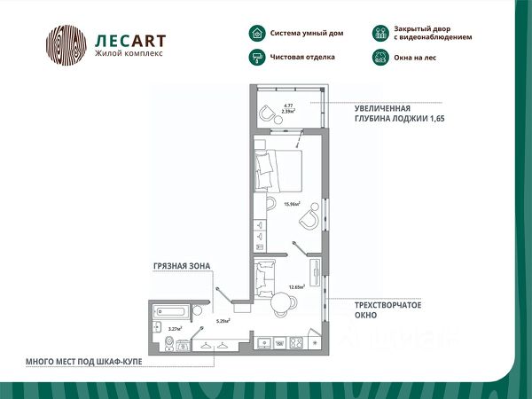 Продаётся 1-комнатная квартира 135, общей площадью 39.56 кв.м., на 10. Дом комфорт-класса, 12 этажей, в окружении леса и малоэтажной застройки. Проект с умным домом. Передача квартир в апреле 2026г. РАСПОЛОЖЕНИЕ И БЛАГОУСТРОЙСТВО Расположение ЖК "ЛесART" порадует любителей чистого воздуха — рядом находятся лесопитомник и Шунгеровский заказник. Особенность комплекса это его ART дворы, которые оформлены по мотивам произведений Василия Кандинского, Пита Мондриана и Пабло Пикассо. Дворы закрыты от машин, что обеспечивает безопасность детей и взрослых. Для семей с детьми особенно удобно наличие детского сада и школы прямо во дворе комплекса. На первом этаже расположены магазины, маркетплейсы, кофейни и всё что необходимо для повседневной жизни. Холлы - это продуманные пространства с колясочными, сквозными проходами и приятной музыкой в лифтах. СИСТЕМА УМНОГО ДОМА В КАЖДОЙ КВАРТИРЕ - Комфорт. Управление освещением, мультимедиа и климат-контролем. - Безопасность. Видеонаблюдение и мониторинг систем безопасности. - Экономия. Контроль систем и оптимизация энергопотребления. - Удобство. Управление с помощью мобильного телефона. ГК "ЕДИНО" Входит в тройку компаний-лидеров региона по потребительским качествам жилых комплексов, объемам ввода жилья и объемам текущего строительства. В цифрах: - 23 года на рынке - Более 50 построенных домов - 60 000+ счастливых обладателей квартир ПРЕИМУЩЕСТВА ПОКУПКИ В ЖК "ЛЕСART": - Сниженная ставка по семейной ипотеке от 5,5%; - Рассрочка без переплаты; - Обмен старой квартиры на новую без комиссии; - Возможность использовать материнский капитал; ЗАПИСЫВАЙТЕ НА ПРОСМОТР! Мы ждем Вас в нашем уютном шоуруме. Вы увидите отделку, дизайнерские решения и познакомитесь со сценариями Умного дома! Такси до офиса продаж и обратно БЕСПЛАТНО!