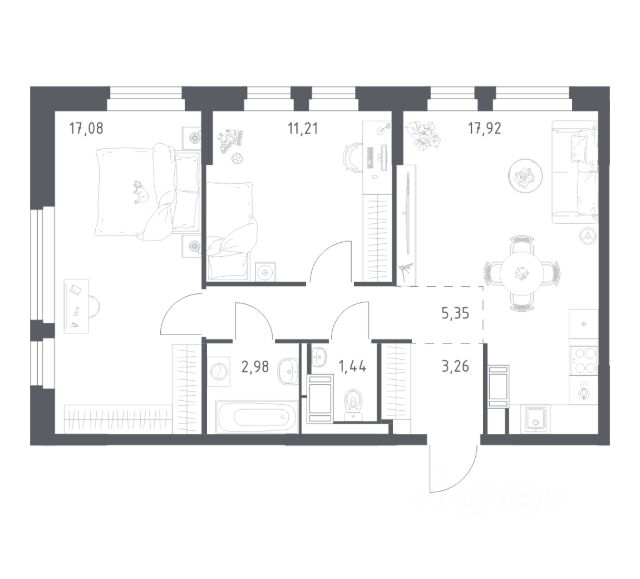 В продаже 2-комнатная квартира в корпусе 35.1 ЖК 'Новое Колпино'. Квартира располагается на 10 этаже, общая площадь 59.24 м2.