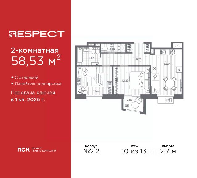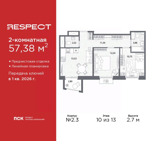 Двухкомнатная квартира с предчистовой отделкой в ЖК "RESPECT" на 10 этаже. Общая площадь: 57.38 кв.м., жилая: 22.99 кв.м., площадь просторной кухни-столовой: 15.53 кв.м. Комнаты изолированные, все окна выходят на одну сторону. В квартире один балкон, один совмещенный и один раздельный санузел. Высота потолков 2.7 м. Дом монолитный, многоподъездный, переменной этажности, от 8 до 13 этажей. Квартира находится в 1-й секции высотой 13 этажей в корпусе 2. На этаже 5 квартир. В подъезде 1 пассажирский и 1 грузовой лифт. Окончание строительства - 1 квартал 2026 года. Оформление сделки по договору долевого участия. В шаговой доступности от жилого комплекса имеются станции метро (расстояние по прямой): "Лесная" (800 м), "Площадь Мужества" (1.4 км), "Выборгская" (1.9 км), также недалеко от этого корпуса находятся станции метро: "Академическая", "Политехническая". Жилой квартал "RESPECT" строится на Полюстровском пр, 87, в одной из самых востребованных локаций Петербурга. В 10 минутах пешком - метро "Лесная" и в 10 минутах на транспорте - Петроградская сторона. Высота домов от 7 до 13 этажей. Квартиры сдаются с отделкой white box и с чистовой отделкой. На территории Respect строится школа на 1125 учащихся и детский сад на 240 мест. Запроектированы собственная газовая котельная, закрытая территория, дворы без машин и подземные паркинги с лифтами. В проекте предусмотрены трапециевидные балконы или остекленные лоджии, которые, с одной стороны, исключают монотонность фасада, являясь декоративными элементами, с другой дополнительным функциональным пространством в квартирах. Цветовая гармония фасадов каждого дома раскрывает характер квартала. Коричневый цвет клинкерного кирпича со структурой водяных штрихов — цвет уюта и безопасности, сдержанности и надёжности. Вентилируемые фасады облицованы клинкерным кирпичом. Его высокая прочность позволяет давать 100 лет гарантии на этот материал. Водопоглощение клинкерного кирпича составляет менее 5%, за счет чего у него высокая теплопроводность и прочность. В квартале запроектированы внутренние закрытые территории дворов домов без доступа автомобилей и безбарьерная среда для велосипедистов и колясок. Предусмотрены IP-домофония с функцией дистанционного открывания калиток и парадных, а также дистанционный сбор показаний счетчиков и мобильное приложение для жителей. Для безопасности жителей квартала - круглосуточное видеонаблюдение и служба охраны. В каждой квартире предусмотрены внешние корзины для кондиционеров. Вся территория квартала будет связана единой концепцией благоустройства, разработанной ландшафтным бюро L.BURO. На эксплуатируемой кровле на уровне первого этажа в домах 1 и 4 будут обустроены общественные видовые террасы. Это станет не только привлекательным местом с красивым видом, но и удобным, многофункциональным пространством. Дизайн парадных зон и входных групп - сочетание лаконичности отделки и декоративных элементов с текстурами из натурального камня и дерева с приглушенной подсветко