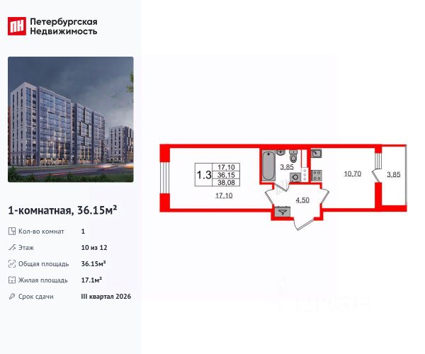 Общая площадь квартиры с учётом застеленной лоджии 36,9 м2. Современная планировка включает в себя просторную кухню- гостиную с выделенной нишей, площадью 14,10 квадратных метров, которая станет идеальным местом для семейных ужинов.