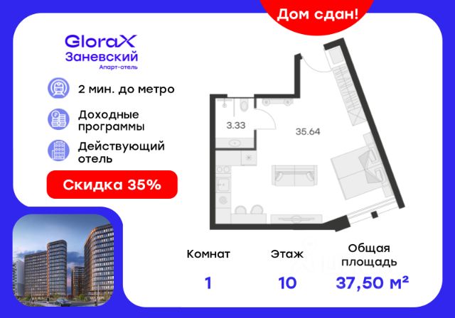 Продается 1-комн. апартамент на 10-м этаже в сданном Апарт-комплексе бизнес-класса "GloraX Заневский". Ключи сразу! Общая площадь лота составляет 46,30 кв. м, из которых 15,96 кв. м отведено под жилую. Номер апартамента - 1 039. Преимущества: - Полная чистовая отделка - Возможность покупки меблировка и техника - Вход по ключ-карте - Прачечная на 1 этаже - Возможность дозаказа отельного сервиса - Программы доходности - Летний бар и променад - Воркаут площадка - Pet-friendly Апартаменты "GloraX Заневский" - проект бизнес-класса с развитой инфраструктурой, удовлетворяющей все потребности самых взыскательных гостей. Располагается в одном из наиболее перспективных, районов Петербурга в 2х минутах от метро "Ладожская" и в 10 минутах от Невского проспекта. В "GloraX Заневский" есть все, что необходимо для комфортной жизни, работы и отдыха. Инфраструктура, покрывающая все потребности и ожидания собственников и арендаторов. В радиусе 150 метров находятся супермаркеты с возможностью доставки продуктов прямо до дверей апартаментов. На 1000 кв. м. общественных пространств расположится уютный лобби-бар, ресторан мировой кухни на 80 человек и оборудованные коворкинги. В апартаментах "GloraX Заневский" выполнена современная отделка с использованием высококачественных экологичных материалов. В проекте предусмотрен подземный отапливаемый паркинг на 100 мест, куда можно спуститься на лифте прямо от дверей апартаментов. Узнайте подробности в Отделе продаж.