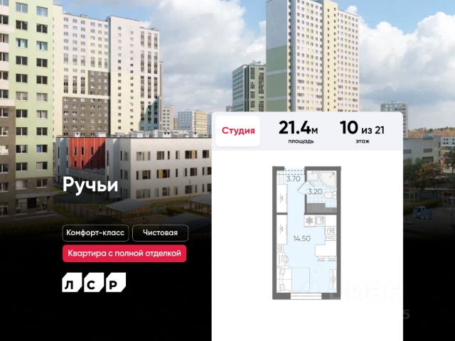 Цена действует при 100% оплате и на определенные ипотечные программы. Подробности — в отделе продаж по телефону. Продаётся 1-комнатная квартира в ЖК "Ручьи" на 10 этаже. Общая площадь составляет 32.00 кв. м. Квартира с чистовой отделкой. Жилой комплекс "Ручьи" располагается по адресу Санкт-Петербург, Красногвардейский. ЖК "Ручьи" - крупный проект комфорт-класса в Красногвардейском районе, на Пискаревском проспекте. В новостройке эргономичные планировки, уютные пешеходные дворы без машин, с детскими и спортивными площадками. Расположение комплекса: • 10 минут до станции метро "Академическая" на автобусе; • 10 минут до ж/д станции "Ручьи"; • 5 минут до КАД на автомобиле. Первая очередь уже заселена, во второй очереди появятся 27 домов. Квартиры передаются с отделкой. Парадные устроены на уровне земли - без ступеней и высоких порогов, а зайти внутрь можно как со стороны двора, так и с улицы. ЛСР построит на территории комплекса школу и два детских сада. Между домами будут обустроены игровые и спортивные площадки с турниками и тренажерами, удобные зоны отдыха для детей и взрослых. Первые этажи отведены под колясочные, магазины и сервисные службы. Здесь есть всё необходимое для комфортной жизни: магазины, аптеки, парикмахерские, пекарни и кофейни, достаточно спуститься на лифте во двор своего дома. Вокруг квартала пройдет велодорожка. Преимущества комплекса: - Большой выбор семейных квартир с просторной кухней-гостиной - Рядом Муринский и Пискаревский парки - Безбарьерная среда - Развитая социальная инфраструктура - Двор без машин Успейте приобрести квартиру на выгодных условиях! Чтобы узнать подробности, обращайтесь за консультацией по телефону.