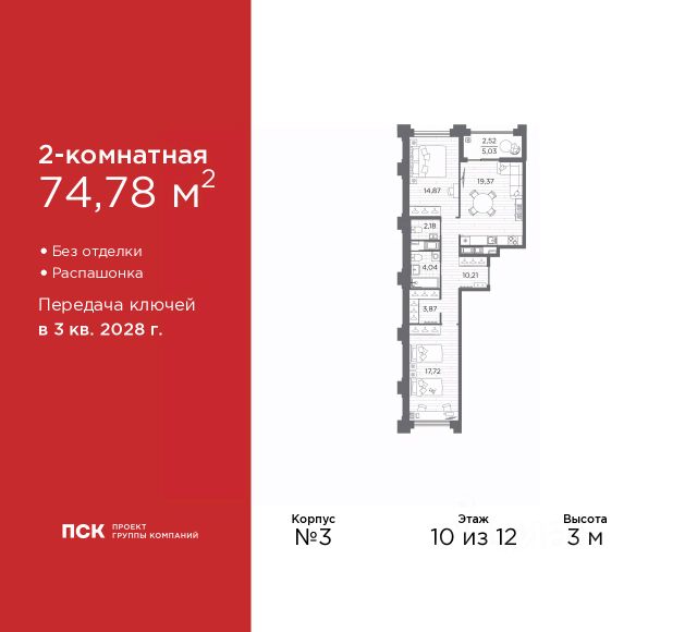 Двухкомнатная квартира в Клубный квартал "Ассамблея" на 10 этаже. Квартира без отделки, после выдачи ключей можно делать ремонт. Общая площадь: 75.36 кв.м., жилая: 32.68 кв.м., площадь просторной кухни-столовой: 18.76 кв.м. Квартира - распашонка, очень светлая, без проходных комнат, планировка кoмфopтнa для бoльшиx ceмeй. В квартире одна лоджия, один совмещенный и один раздельный санузел. Высота потолков 3 м.