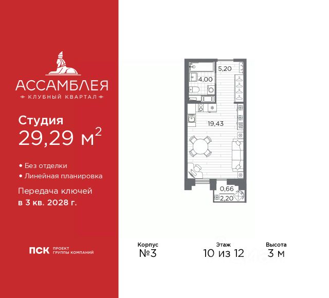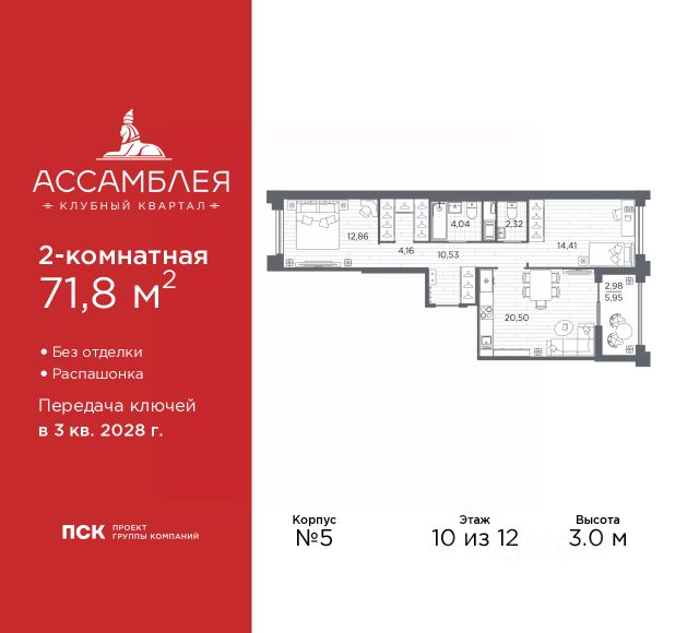 Двухкомнатная квартира в Клубный квартал "Ассамблея" на 10 этаже. Квартира без отделки, после получения ключей можно делать ремонт. Общая площадь: 71.8 кв.м., жилая: 27.27 кв.м., площадь просторной кухни-столовой: 20.5 кв.м. Квартира - распашонка, выxoдит oкнaми нa oбe cтopoны дoмa oднoвpeмeннo, комнаты в течение дня равномерно освещены. В квартире одна лоджия, один совмещенный и один раздельный санузел. Высота потолков 3.0 м. Дом монолитный, черырехподъездный, высотой 12 этажей. Квартира находится в 1-й секции в корпусе 5. На этаже 6 квартир. В подъезде 1 пассажирский и 1 грузовой лифт. Окончание строительства - 3 квартал 2028 года. Оформление сделки по договору долевого участия. В шаговой доступности от жилого комплекса имеются станции метро (расстояние по прямой): "Горный институт" (1.0 км), "Василеостровская" (1.4 км), "Приморская" (1.5 км), также недалеко от этого корпуса расположены станции метро: "Спортивная", "Чкаловская". "Клубный квартал Ассамблея" — проект бизнес-класса на Васильевском острове, в самом сердце исторического Петербурга. Комплекс состоит из пяти корпусов переменной этажности — от 7 до 12 этажей — с выразительной архитектурой в стиле неомодернизма: светлый клинкер, панорамное остекление, просторное лобби с потолками высотой почти 8 метров. Потолки — до 3,2 метров. Подземный паркинг на 667 машиномест. Комфорт и инфраструктура Проект ориентирован на комфортную городскую жизнь. В закрытом дворе — ландшафтное озеленение, современные детские и спортивные площадки. Внутренний клуб для резидентов включает коворкинг, переговорные, кинозал, фитнес и бьюти-зону. IP-домофония с просмотром камер видеонаблюдения, дистанционное открывание дверей и доступа на территорию и в парадную со смартфона и планшета, просмотр показаний счетчиков, приложение для жителей PSK Home. Локация Расположение на Васильевском острове — сильная сторона проекта. До четырех станций метро ("Горный институт", "Василеостровская", "Спортивная", "Приморская") — 515 минут пешком. В шаговой доступности — зелёные зоны, культурные учреждения, в том числе сад "Василеостровец" и ДК имени Кирова. Основные магистрали Большой, Средний и Малый проспекты, Наличная и Уральская улицы. Съезд на ЗСД расположен недалеко от станции метро "Приморская", близ береговой линии. Благовещенский и Дворцовый мосты соединяют остров с центром города, а мосты Тучков, Биржевой и Бетанкура — с Петроградской стороной. Застройщик Группа компаний ПСК является одной из ведущих девелоперских компаний Санкт Петербурга. На протяжении 18 лет она возводит в Северной столице качественное жилье премиум, бизнес и комфорт-класса, социальные объекты школы и детские сады, апарт-отели и торговые центры. Является шестикратным обладателем золотого знака "Надежный застройщик России". #zM4bbM
