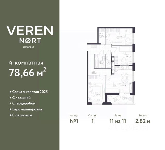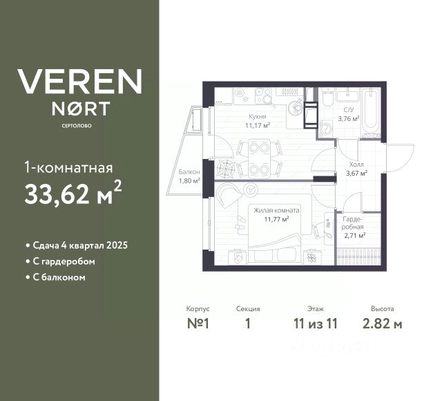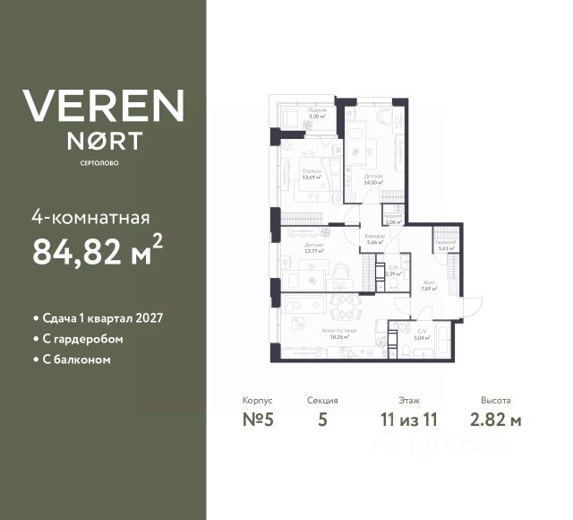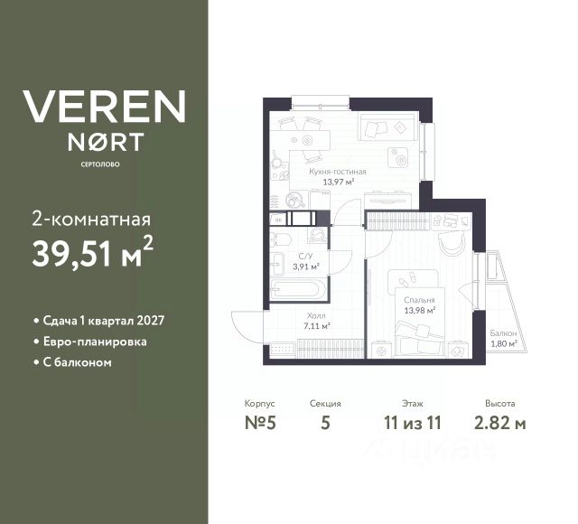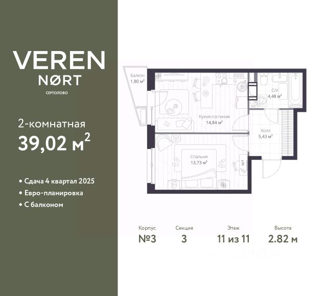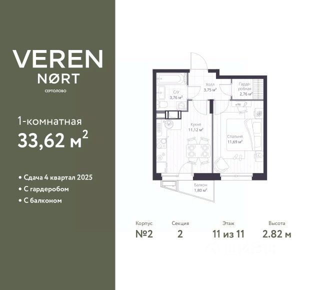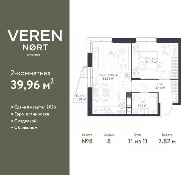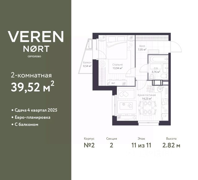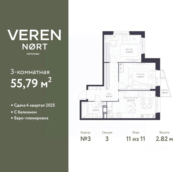 Продается 2-комн. квартира в Veren Nort Сертолово на 11 этаже. Квартира без отделки, полностью готова к ремонту. Общая площадь: 55.79 кв.м., жилая: 25.47 кв.м., площадь просторной куxни-гостиной: 15.27 кв.м. Квартира угловая, очень светлая, естественная вентиляция при открытии окон. В квартире один балкон, один совмещенный санузел. Высота потолков 2.82 м.